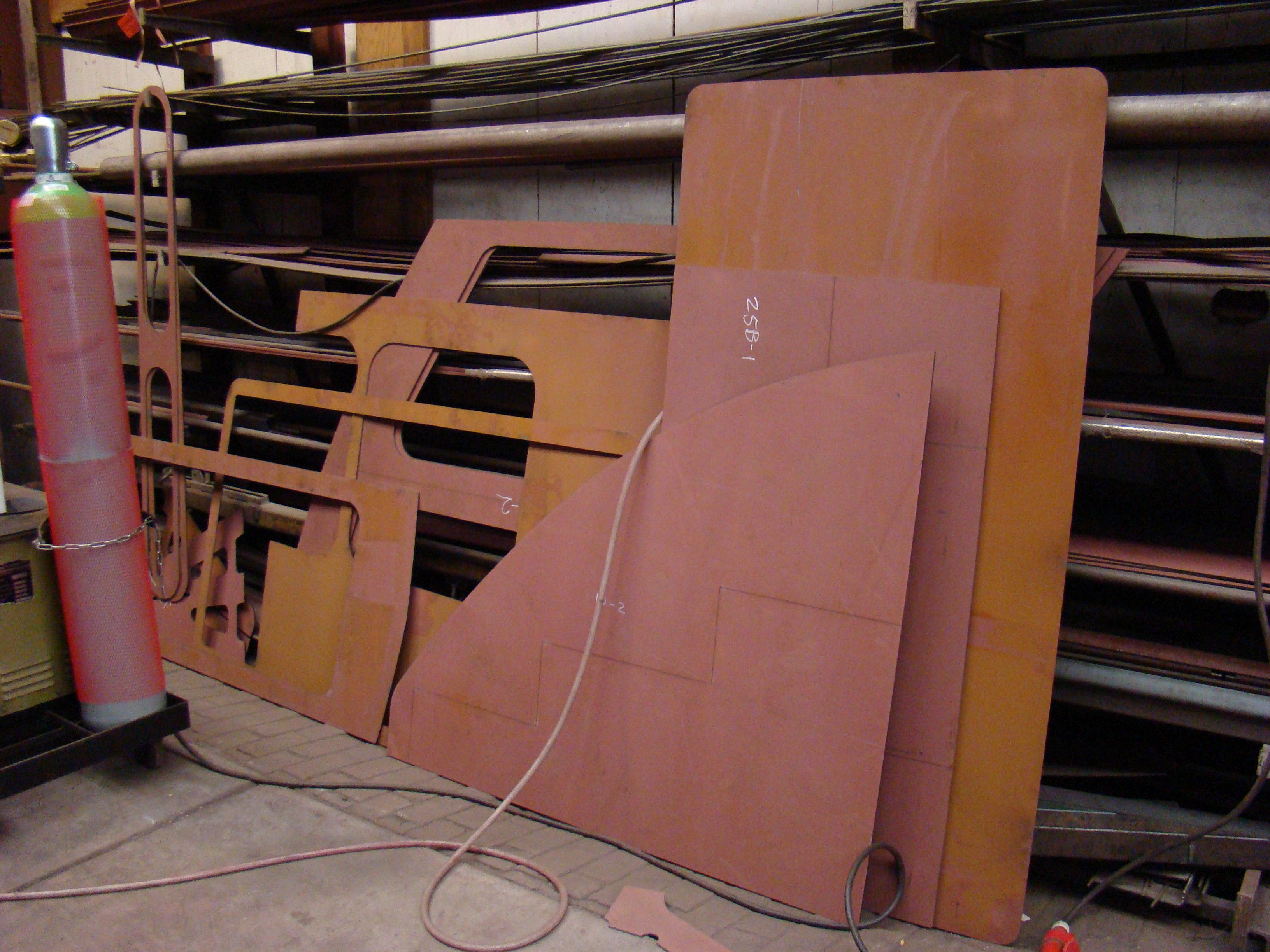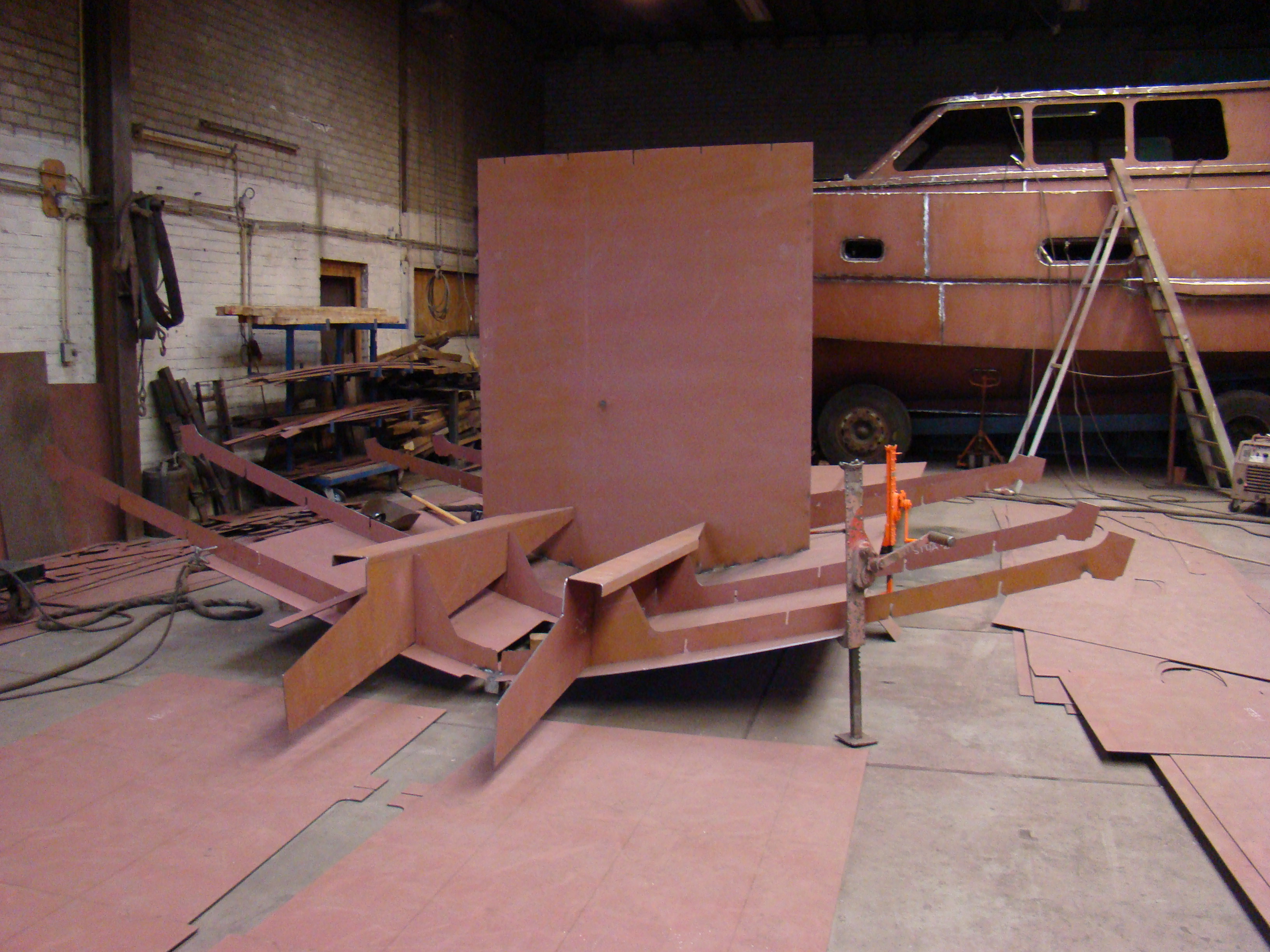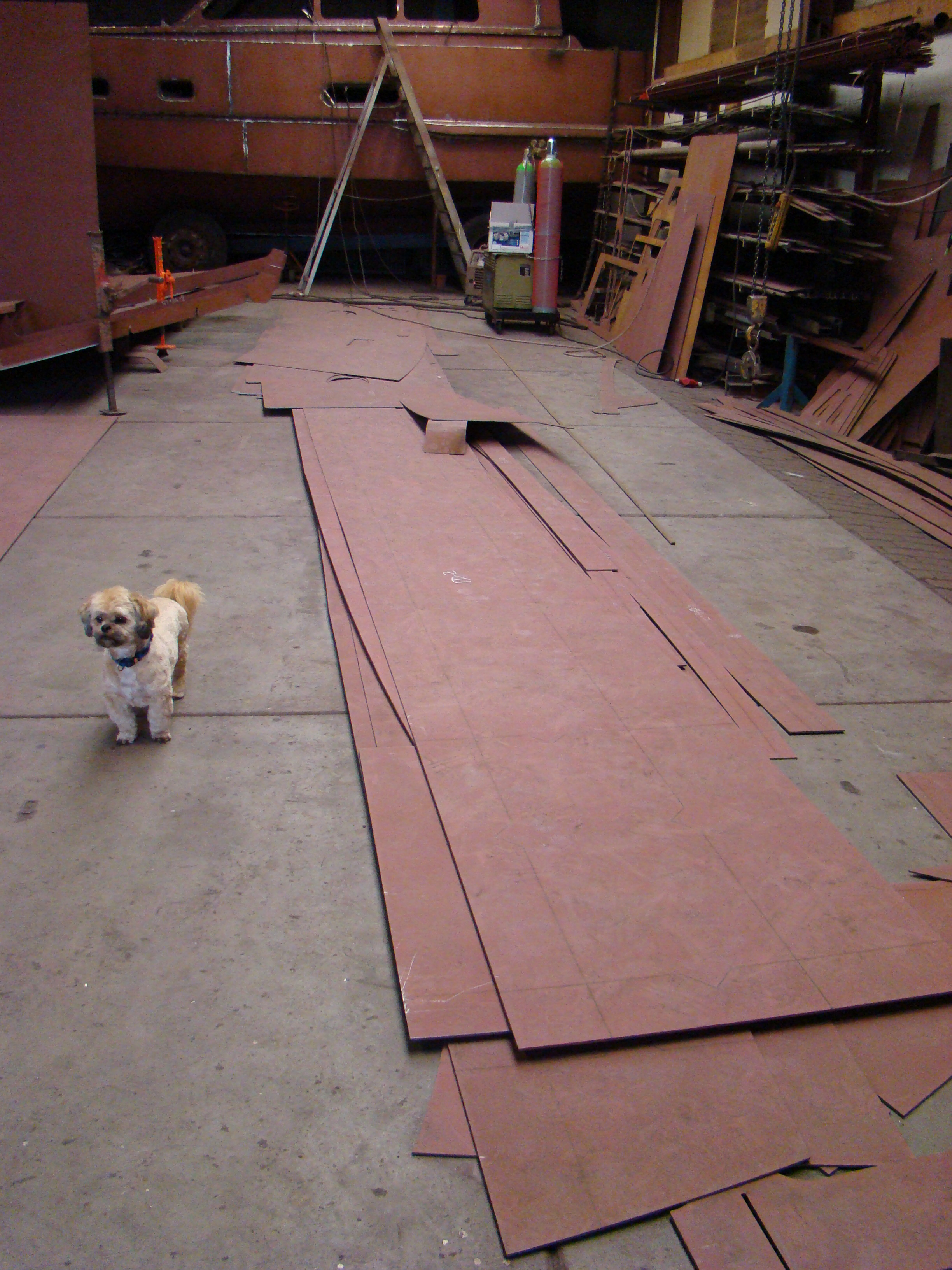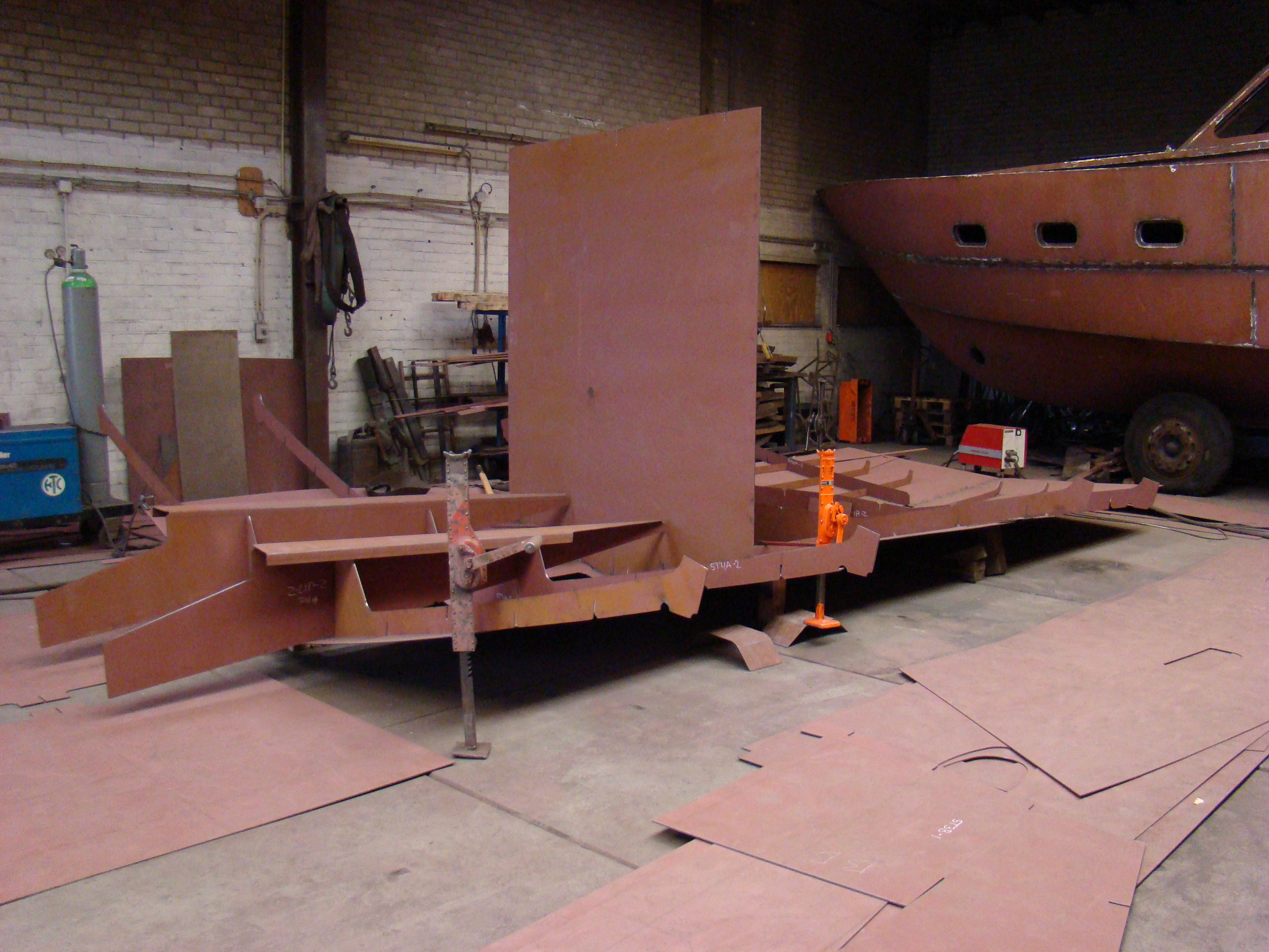 Vorige week had ik een enorme verrassing. Ik kreeg de rekening binnen voor de start van de bouw van ons motorjacht. Hoe kan dat nou? De werf, Marhen Yachting uit Harderwijk , zou pas in januari 2011 beginnen met de bouw van de Xanthiona. Na een kort telefoontje bleek, dit beter in hun planning te passen en dus hadden ze het staalpakket maar alvast besteld. En Martin Pomp, eigenaar van Marhen, was al bezig alle staalplaten op de vloer uit te leggen. Een week later stond ik bij Marhen op de stoep en hieronder zie je het resultaat. De eerste platen zijn al aan elkaar  gelast en je kunt al een beetje de vorm zien. Alle staalplaten die op de vloer liggen, tegen de wanden staan en in de rekken liggen, horen bij het bouwpakket. Mocht je het niet meer weten of dit voor het eerst lezen, het is een Almarine 1700 bouwpakket van een ontwerp van Hans Alma. De komende periode zul je zeker meer kunnen lezen en meer foto’s bekijken.
