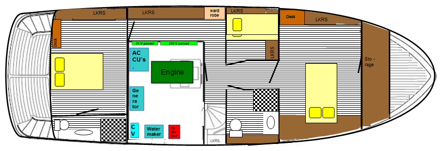 Een aantal keren heb ik al geschreven over het interieur beneden. 2 weken geleden ben ik nog eens met de duimstok aan de slag gegaan en had toch weer twijfels over de laatste indeling die we hadden bedacht. Op de tekeningen lijkt het allemaal wat gunstiger omdat ik niet voldoende rekening hou met het naar binnenkomen van de zijwanden voorin. Dat scheelt echt veel ruimte. Met de duimstok erbij daadwerkelijk op het schip meten is het allemaal veel minder gunstig. Dan blijkt bijvoorbeeld dat in de grootste gastenruimte er eigenlijk maar ca. 40 cm ruimte is langs het bed. Ook de mogelijkheden voor de kleinere gastenkamer met de stapelbedden zijn beperkt.