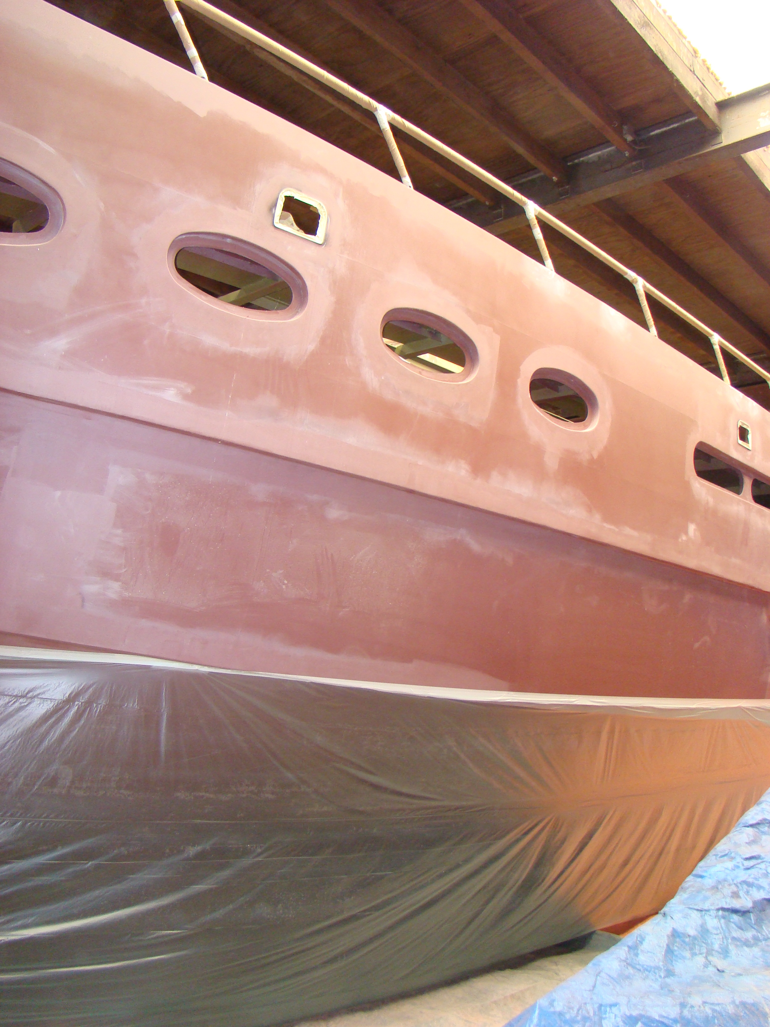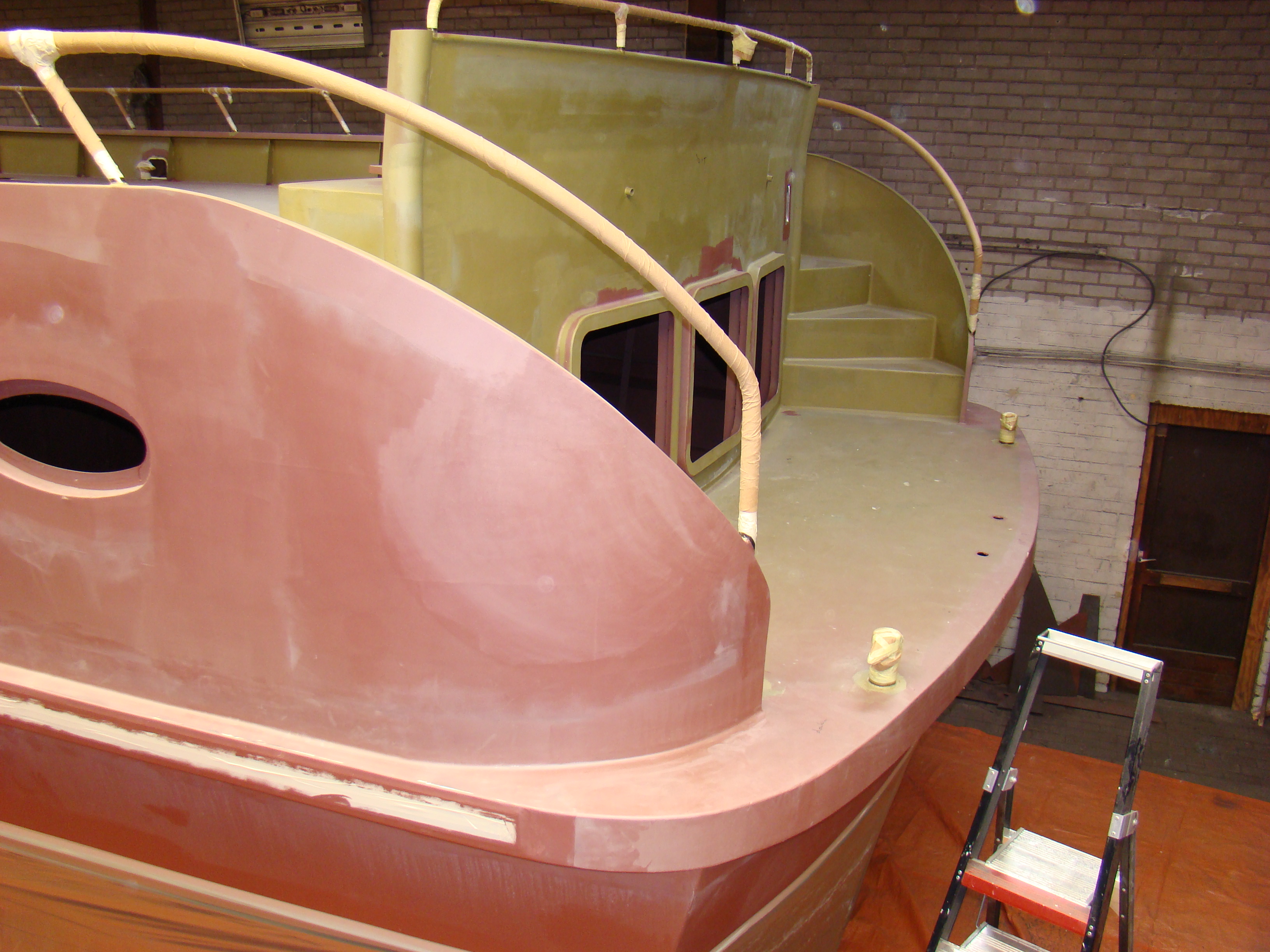 De romp is helemaal voorbereid om gespoten te worden. Men gaat zelfs dit weekend er al mee aan de slag en naar verwachting is het geheel eind volgende week klaar. Ik ben heel erg benieuwd. De kleursamenstelling van de romp wordt zoals op onderstaande foto, waarbij de opbouw, de achterzijde en de trappen wit worden. Waar je op de foto beige ziet wordt het bij ons dus grijs, voor de rest dus hetzelfde.