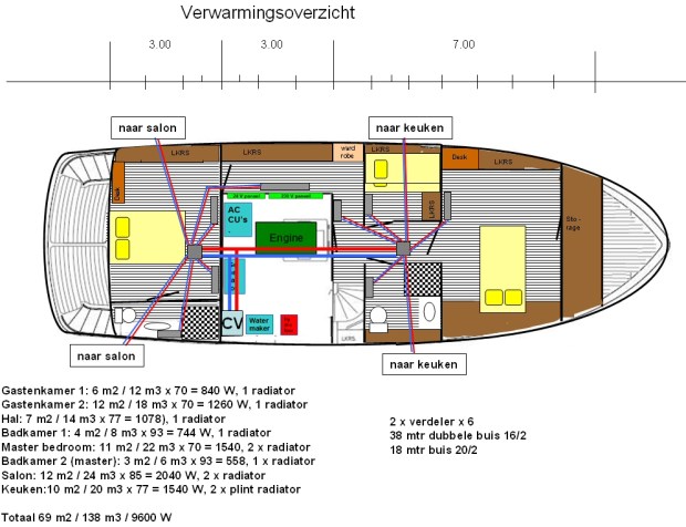 Voor de reis naar Duitsland van ons motorjacht Xanthiona, wil ik eigenlijk eerst de centrale verwarming nog voor een groot deel aangesloten hebben. Als voorlopige oplossing heb ik een flink aantal radiatoren gekocht die ik kan aansluiten, maar ik had nog geen goed idee hoe het allemaal moest. Na wat advies van mijn motorbootvarende collega Marc en mijn technische vriend Kees, heb ik nu al weer heel wat geleerd over CVs, buizen, verdelers, thermostaten, radiatoren, koppelingen, druk verdelen en gelijkmatig verwarmen. Op het onderstaande schema zie je hoe ik het denk uiteindelijk aan te sluiten, met 2 verdelers van 6 groepen voor totaal 12 mogelijke radiatoren of convectoren. Voorlopig sluit ik er maar 5 aan, maar met de 2 verdelers van 6 groepen ben ik voor de toekomst erg flexibel.