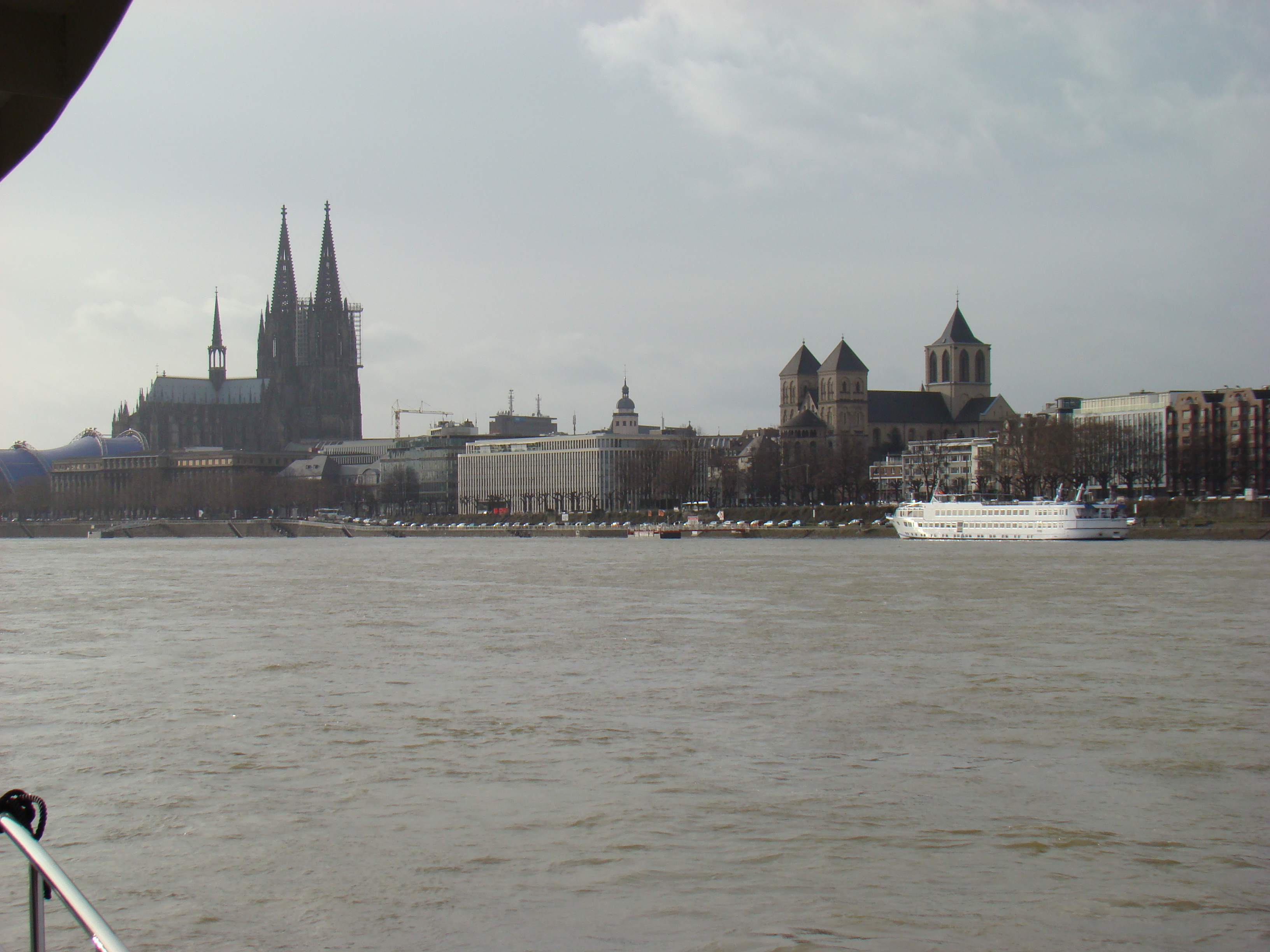 Vandaag is ons motorjacht Xanthion op weg naar de eindbestemming Oberwinter (bij Bonn) in Duitsland. Na de aanvankelijke pech bij de vorige poging anderhalve week geleden, is er na het aanbrengen van een dubbel koelwaterfilter en een alarm in de uitlaat, voldoende vertrouwen om de Xanthiona veilig naar Oberwinter te varen. De Duitse schipper is weer ingehuurd en vanochtend om half acht vertrokken we uit Dusseldorf. Met een gemiddelde van voorlopig precies 10 km per uur voeren we Keulen om 13.30 uur voorbij en hopen dan om 18.00 uur in Oberwinter aan te komen.