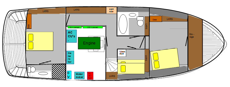 Deze week heeft in ieder geval geleid tot een iets andere indeling benedendeks. Nu plan ik de gastenkamer met stapelbedden op stuurboords kant. Hierdoor kan ik de loze ruimte achter de draaitrap gebruiken als bergruimte in die kamer.