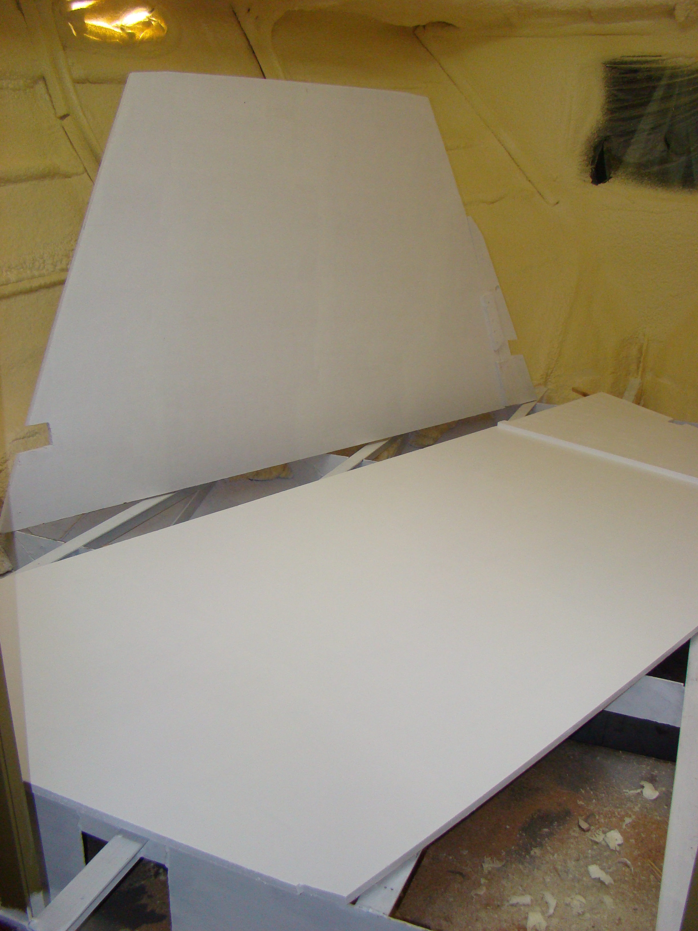 De vloerdelen die ik in de afgelopen week op maat heb gezaagd voor de gastenkamers van ons motorjacht Xanthiona, hebben inmiddels een laag grondverf en een dekkende laag verf gekregen. Om te voorkomen dat eventueel vocht of condens op den duur toch zou kunnen inwerken op onbehandeld hout, is het uiteraard slimmer (advies van anderen) om het hout ook aan de onderkant te beschermen. Vele uren later zie je het resultaat op bijgaande foto’s en dit is nog maar slechts een deel van wat nog moet gebeuren voor de hoofdslaapkamer en de vloeren in de keuken en het woongedeelte.