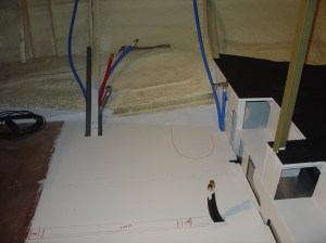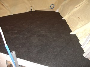 Vorige week kocht ik rubbergranulaat op rol om als tussenlaag te fungeren voor de vloeren (wala.nl). Op die manier hoop ik contactgeluid en trillingen tegen te gaan. Met speciale kit wordt de rubbergranulaat op de geverfde 1e laag multiplex gelijmd. Over het rubbergranulaat komen straks 10 mm multiplex (Uniprime) en dan de uiteindelijk 5 mm PVC clicklaminaat vloer.
