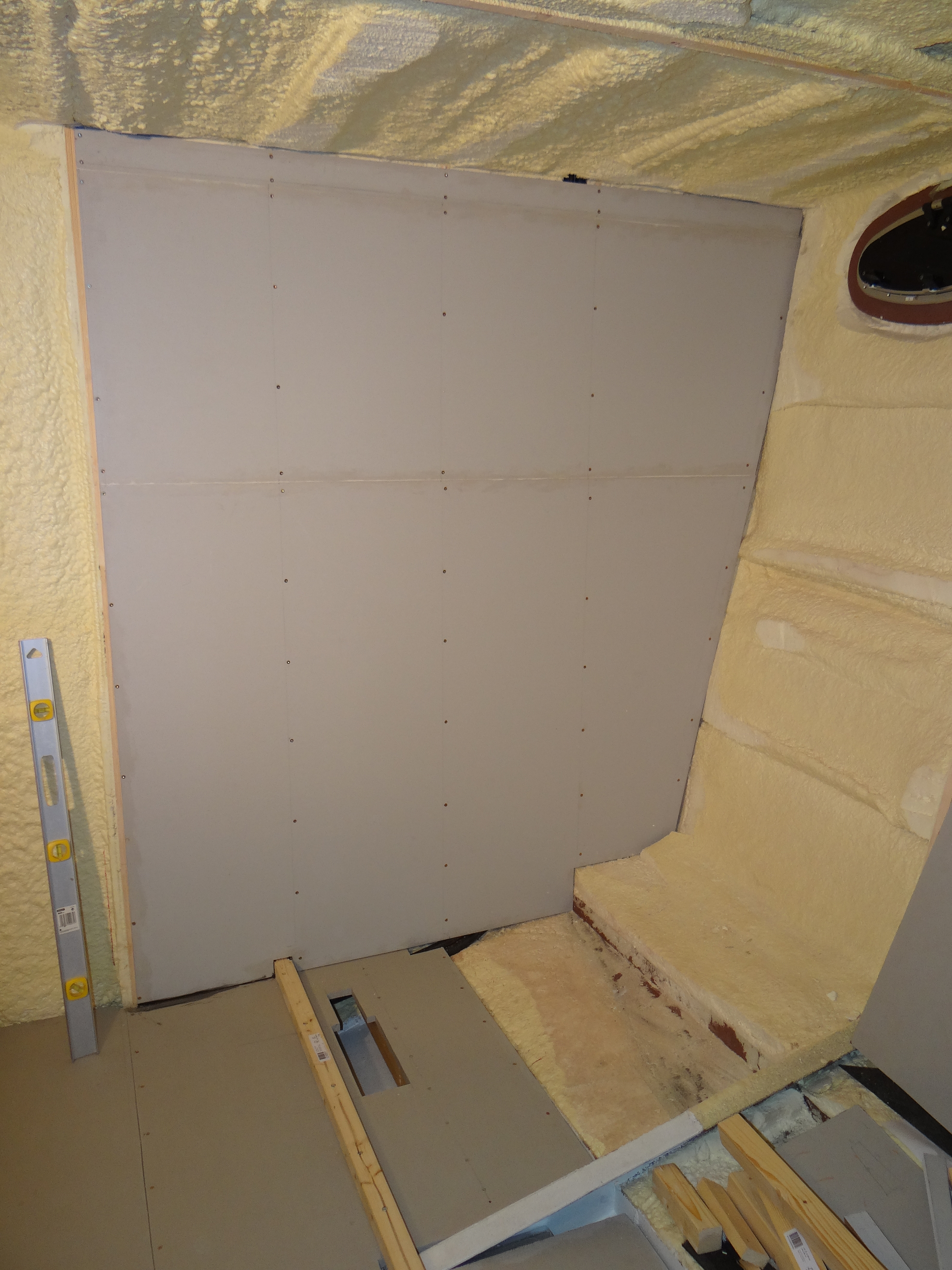 Vorige week heb ik eerst de isolatie onder de vloer aan stuurboord kant aangebracht en de vloer definitief vastgekit en geschroefd. Deze week heb ik het eerste gedeelte van de wand tegen de motorruimte er in gemaakt. Dit was nodig omdat de wand aan stuurboord hier nauw op moet aansluiten, in deze hoek komt namelijk de douche. Dat moet allemaal goed gekit en waterdicht zijn. Op de wand komt later voor de zekerheid nog een speciale waterdichte laag voordat de tegels er op gaan. Door de ervaring van de 1e wand gaat het nu allemaal wat vlotter.
