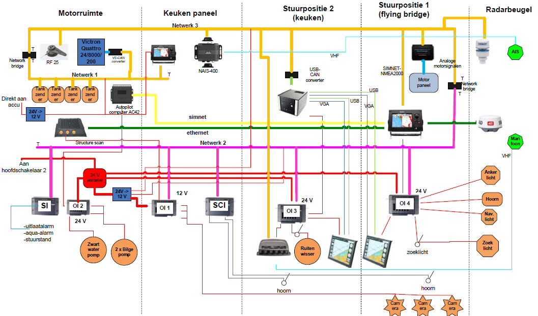 Voor alle navigatie-apparatuur leek ik eerst aardig op weg om het schema eenvoudiger te maken. Ik heb o.a. bijna alle schakelaars er uit gegooid en ga het meeste aan/uit zetten via de beeldschermen. Ik gebruik dus het Czone (op basis van NMEA 2000) systeem, maar realiseerde me ook dat er vele dagen zijn dat ik niet vaar, maar wel de stand van alle tanks (drinkwater, zwartwater, diesel en gasolie) wil weten zonder het hele systeem aan te zetten. Ook handig als je altijd kunt zien wat je accu’s doen en of je nog walstroom hebt. Om te voorkomen dat je de meters dubbel uitvoert (analoog en digitaal via Czone), sluit ik nu een deel van het Czone netwerk rechtsreeks aan op de serviceaccu zonder tussenkomst van een hoofdschakelaar. Dit deel wordt gescheiden van de rest via een netwerkbrug. Ook de bediening en uitlezing van de Victron Quattro omvormer/lader verloopt via dit deel en wordt samen met de stand van de tanks op een aanraak-beeldscherm weergegeven.