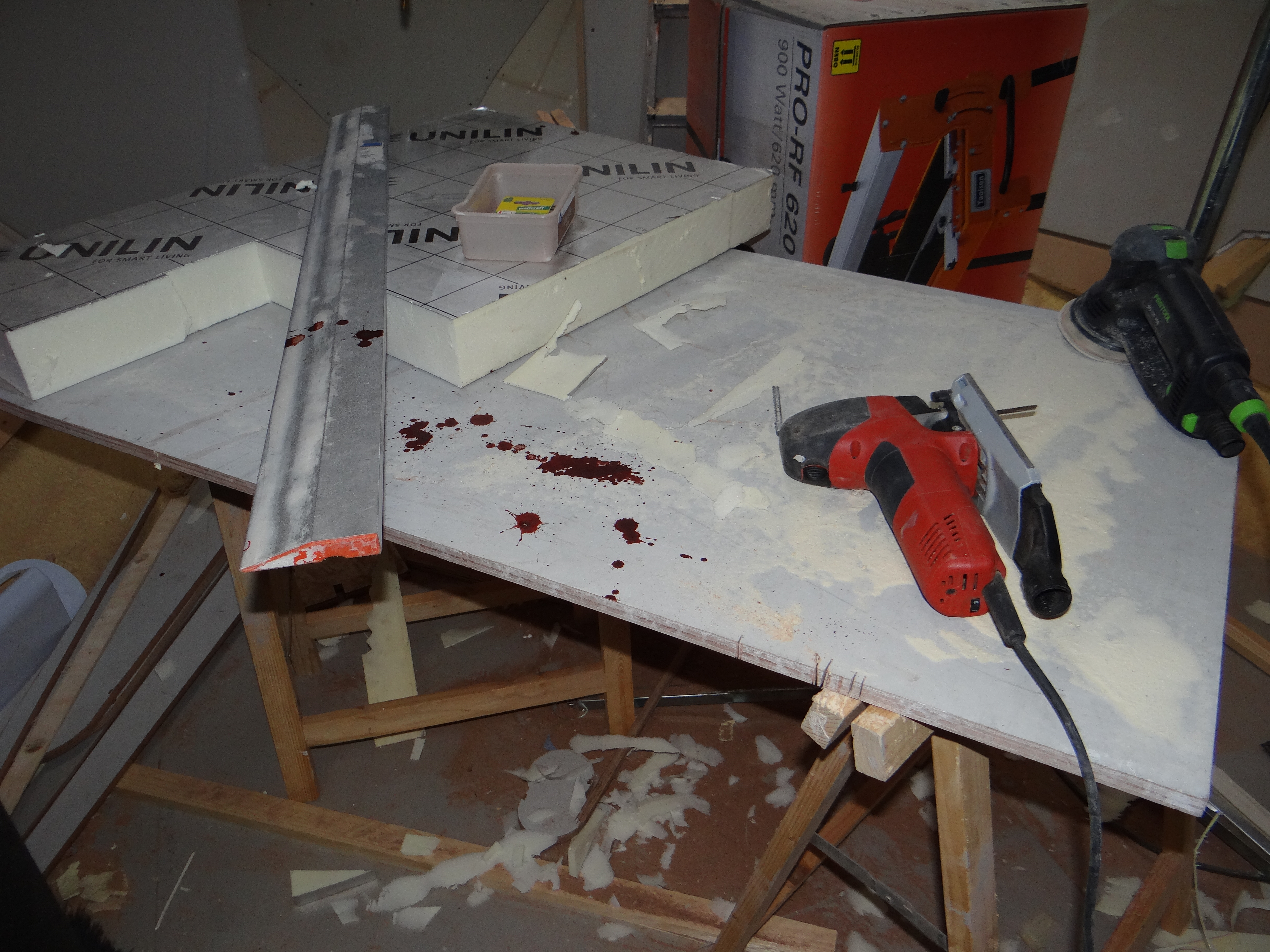 Ik was zeer tevreden met mijn dure Maffel decoupeerzaag, je kunt er alles mee doen. Zelfs in je hand zagen bleek iets meer dan 2 weken geleden ’s avonds laat. Dat was even schrikken, het bloed spoot uit de wond in het midden van mijn handpalm. Met een flinke prop tissue in mijn hand geklemd ben ik naar de spoedeisende hulp van het 15 minuten verderop gelegen ziekenhuis gereden. De wond was ernstig genoeg om de handchirurg van thuis te halen die de doorgesneden zenuw en bloedvat weer aan elkaar heeft gezet. Als verrassing mocht ik ook nog 5 dagen in het ziekenhuis blijven voor wondcontrole en een anti-biotica kuur.