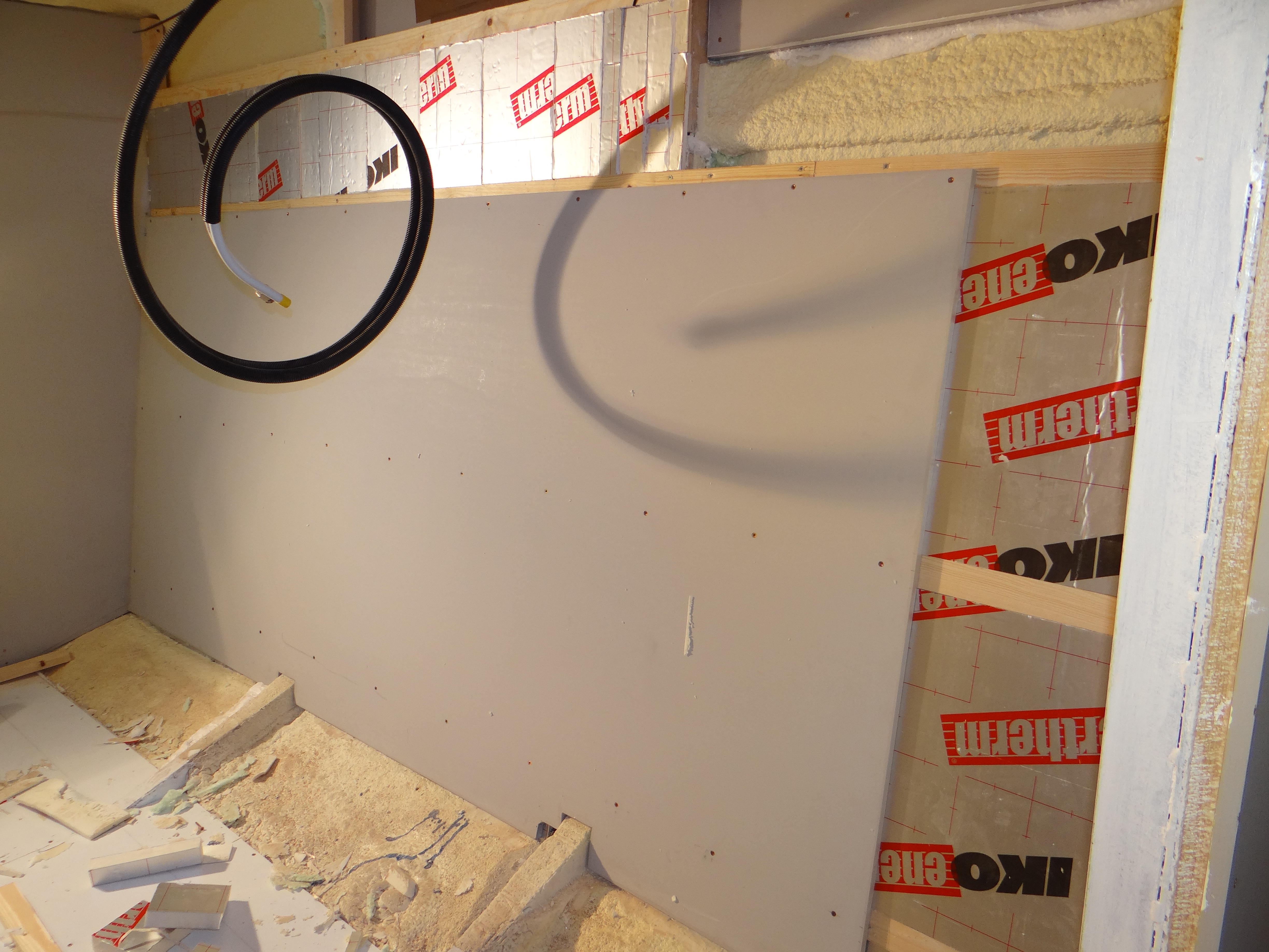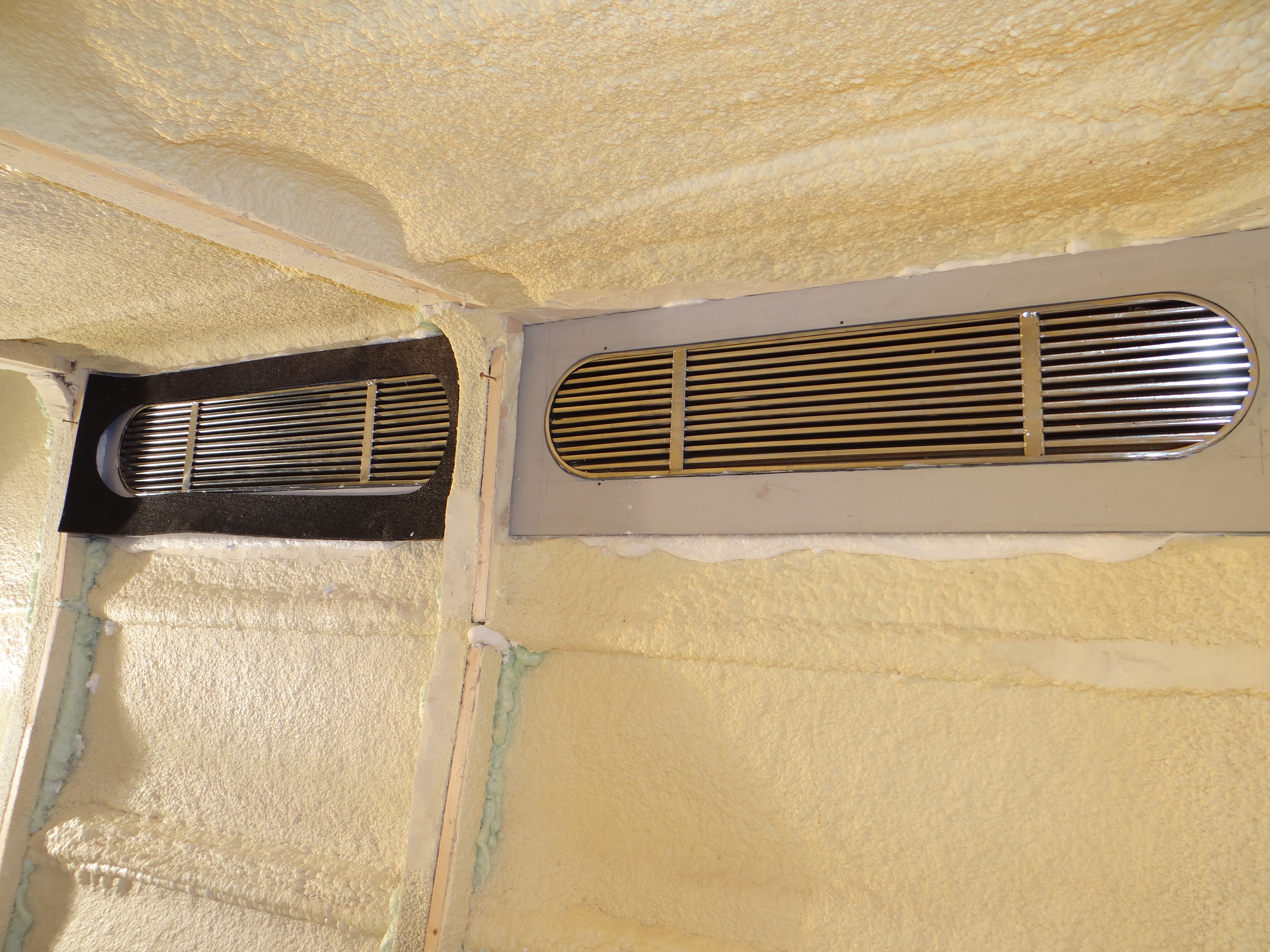 Op de foto’s onder zie je achtereenvolgens hoe ik de ventilatieroosters voor een groot deel dicht maak, extra isolatie bij de buitenwand aanbreng en het voorlopig resultaat: de wanden klaar.