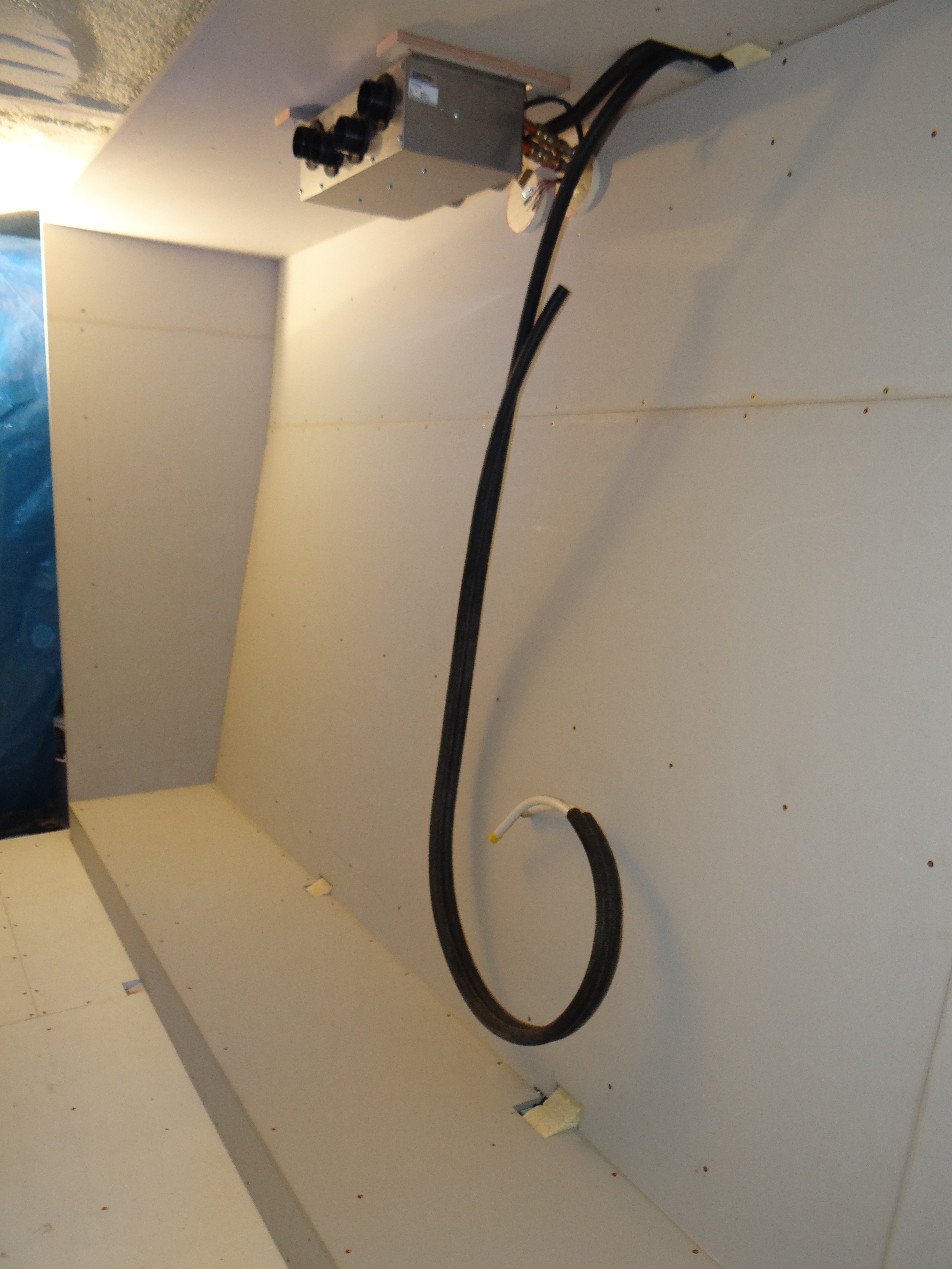 De hal naar de achterkajuit was de volgende etappe van de benedenverdieping. De vloer ligt, wanden zijn ingetimmerd en nu nog een even bedenken hoe hier de grote kast met schuifdeuren ingemaakt moet worden. De kast wordt deels om de ventilatieroosters heen gebouwd. Deze roosters op de bakboordskant (links) hadden eigenlijk geen functie, maar ik ga ze gebruiken om de vochtige lucht uit de voorste badkamer te halen en om verse en droge lucht in de achterkajuit en de voorste gastenkamer te blazen. Met behulp van een fancoil wordt verse lucht aangezogen, deze wordt gedroogd (althans zolang de kachel aan staat, de fancoil wordt namelijk in het CV circuit opgenomen) en dan door luchtslangen naar achteren en naar voren geleid. Door de luchtstroming en de overdruk die ontstaat, zal de lucht zich ook verplaatsen naar de rest van het schip en zal vochtige lucht en vieze luchtjes worden voorkomen (althans dat hoop ik dan maar) (zie ook volgend bericht over de werking van de fancoil).