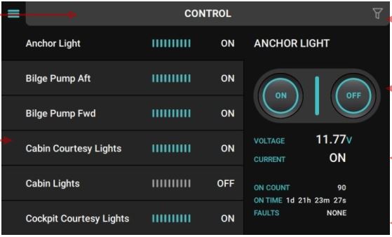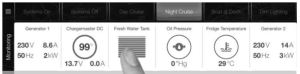 Zoals eerder beschreven heeft de Xanthiona een ‘distributed power’ systeem van Czone, waarbij dikke stroomkabels naar een vijftal modules lopen verspreid over het jacht en op elke module zijn de lokale gebruikers aangesloten (6 per module). De modules zijn onderling gekoppeld via NMEA2000 en aangesloten op de Simrad kaartplotters met ingebouwde Czone software, een 3.5 inch Czone schermpje en via een USB gateway op een navigatiePC. Het huidige Czone schermpje is net groot genoeg om 5 statusregels te tonen en ik moet even scrollen om de overige 2 te zien.