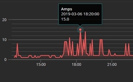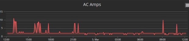 Dat is de theorie. Dankzij het SeaSmart ‘remote monitoring’ systeem dat nu enkele weken draait op de Xanthiona, kan ik in de praktijk vanaf afstand het stroomverbruik en ook de pieken bijhouden. In 3 weken tijd is slechts enkele malen stroom bijgeleverd vanuit de accu’s door de Quattro 5000. Uit de grafiek blijkt een piek van -90 A , in Watts is dat dan 2160 W. Samen met de 3680 W walstroom was de eenmalige piek tot nu toe 5840 W.