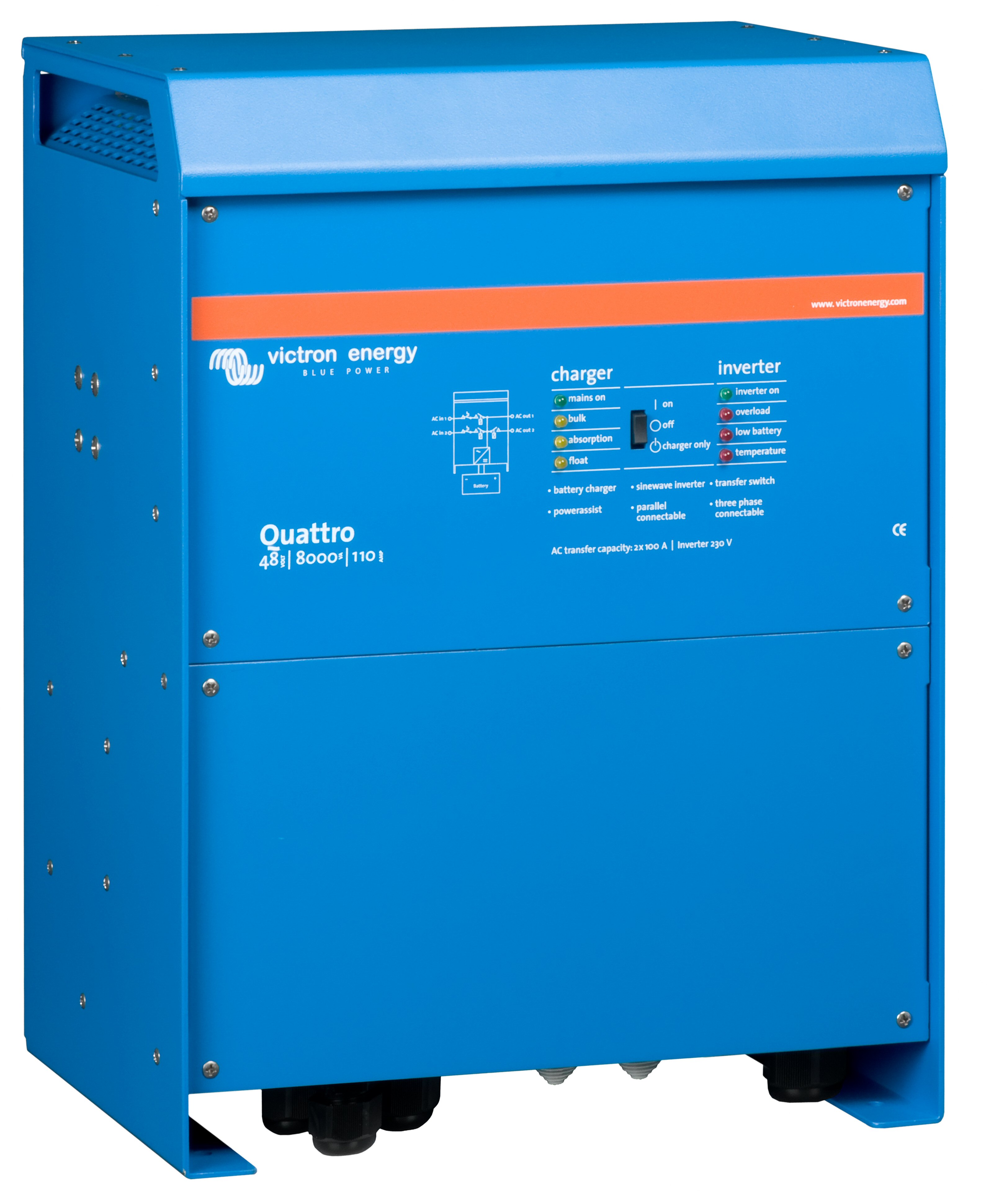De walstroom van 16 A levert 3680 W, de rest van de mogelijke 9870 W tijdens de piek kan worden bijgeleverd vanuit de service-accu door bijvoorbeeld een Victron omvormer, zoals een MultiPlus of Quattro. In ons geval een Quattro 5000. Deze levert een continu vermogen van 4500 W en een piek van 10.000 W. Totaal beschikbaar 3680 + 4500 = 8180 W, met een piek van 13.680 W. Hoe lang die piek mag duren is niet duidelijk in de documentatie.
