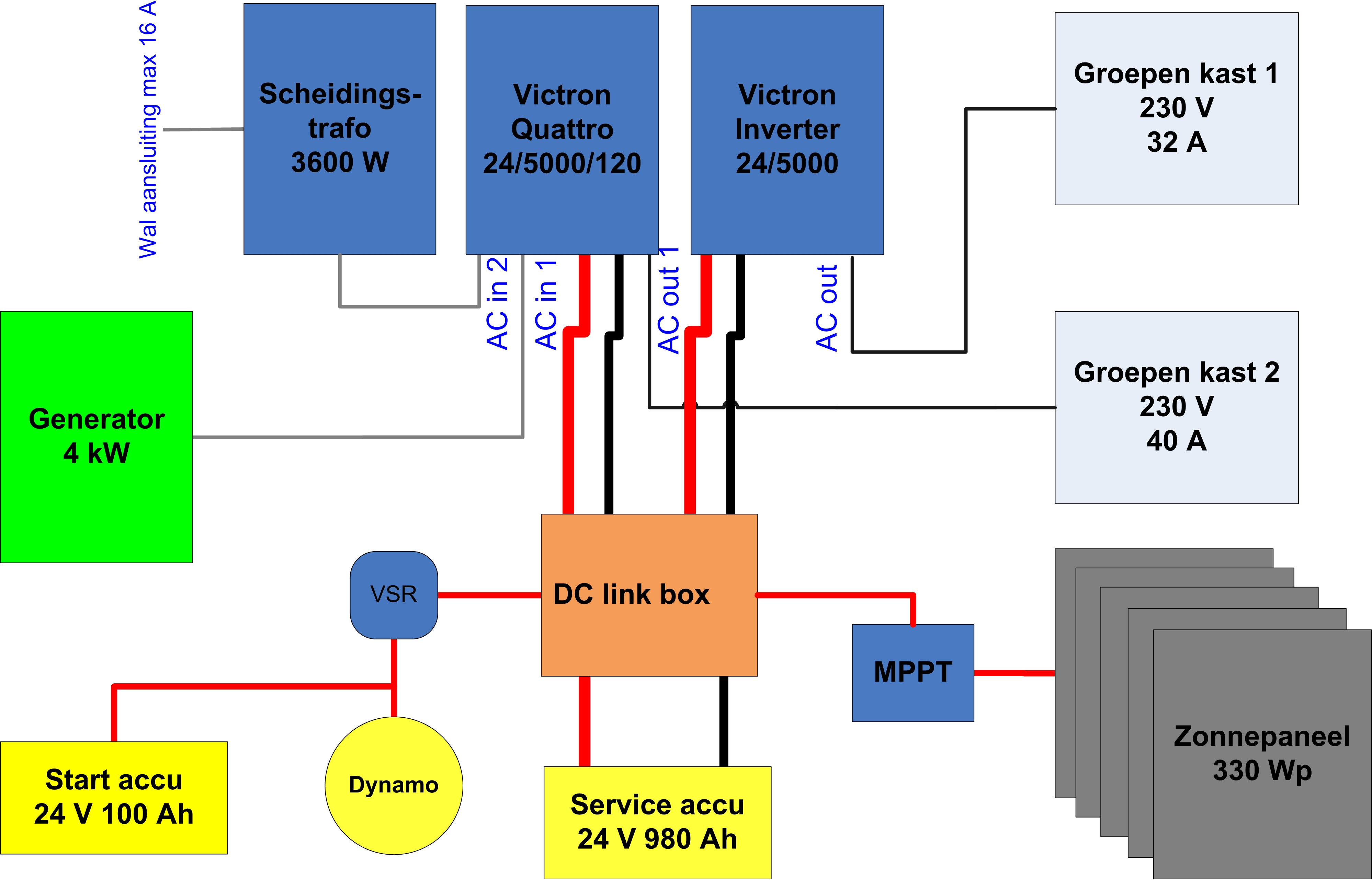 We komen nu even op een punt met een ‘denkfout’. Op de Xanthiona heb ik vanaf het begin de lichte gebruikers en de zware gebruikers gesplitst in 2 groepen, elk met een eigen groepenkast. Als er geen walstroom is en geen generator draait, wordt de groep met zware gebruikers door de Quattro afgeschakeld. Dit is om te voorkomen dat de accu’s onnodig worden ontladen. Als ik zoveel mogelijk de verbruikte stroom van de service accu’s wil aanvullen door de zonnepanelen en de generator blijft uit, dan heb ik de zware gebruikers niet beschikbaar. Om dit te veranderen zou ik alsnog de groep met zware gebruikers op dezelfde uitgang van de Quattro als de lichte gebruikers moeten aansluiten, zodat die ook tijdens het varen stroom hebben.