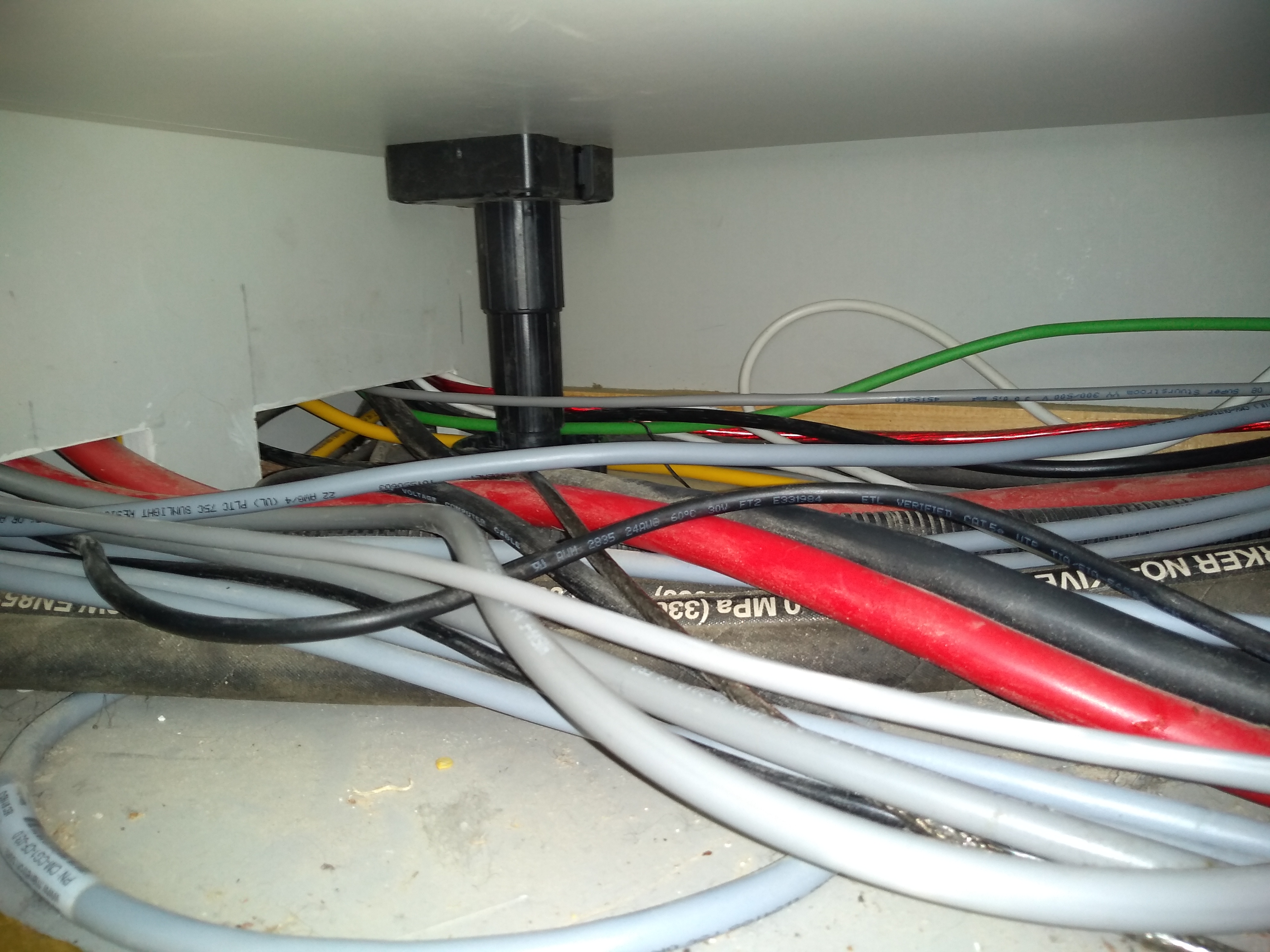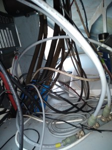 Het resultaat van het doorvoeren van al deze kabels naar de flying bridge zie je op de laatste foto. Lijkt ook wel wat op spaghetti, met dien verstande dat dit volledig uit het zicht is en dat sommige kabels die niet ingekort kunnen worden of waarvoor wat extra lengte is aangehouden, hier onder het instrumentenpaneel is opgebost. Als ik heel veel tijd heb ga ik dit nog wel wat verder fatsoeneren.