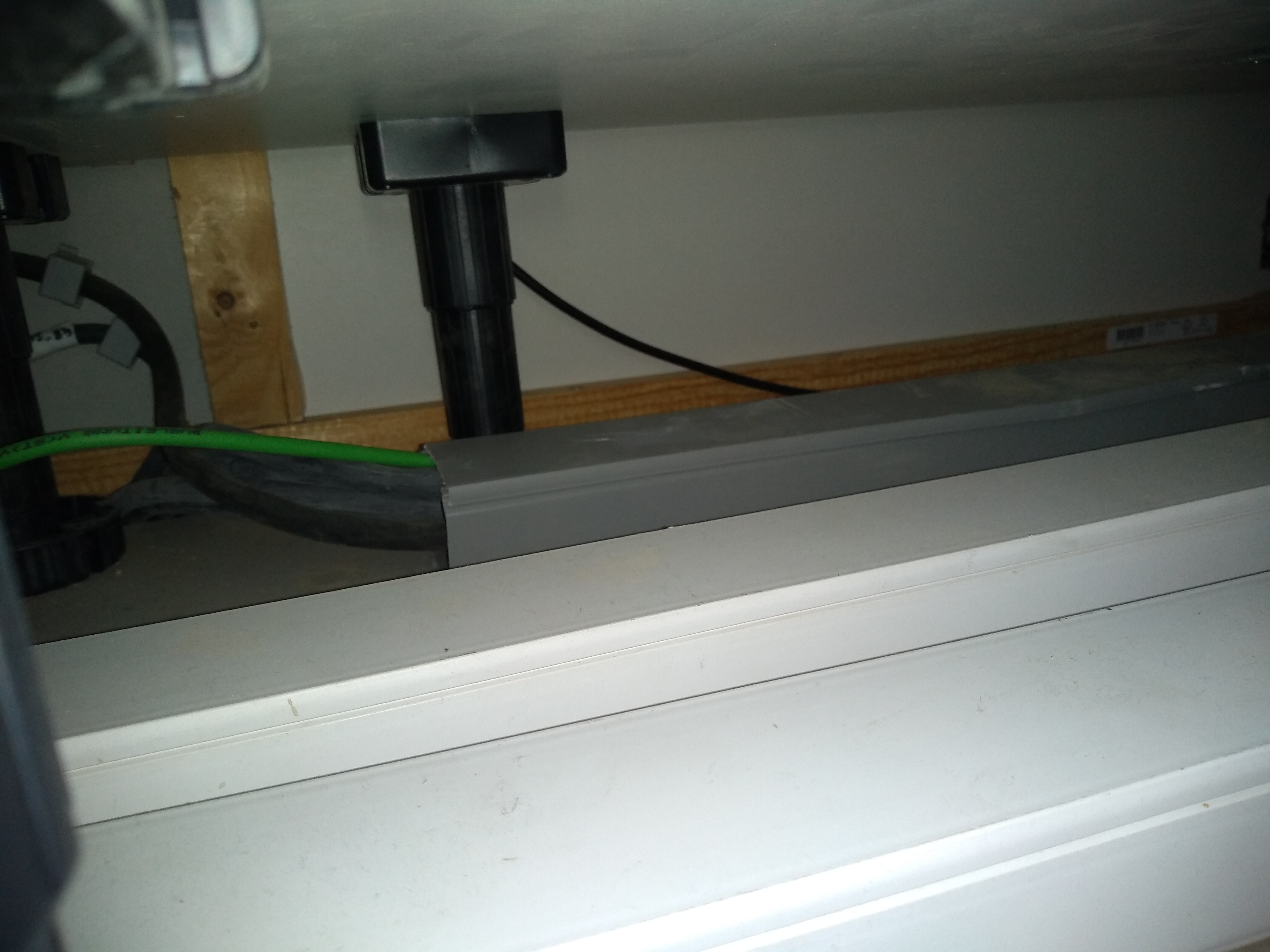 Onder de keuken door: de 230 V kabels in grijze koker 10 cm gescheiden van 24 V kabels in witte kokers