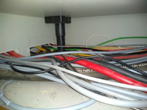 De praktijk is echter weerbarstig en uiteindelijk eindig je toch op bepaalde plekken met een behoorlijke spaghetti aan kabels. Tussen de salon en de keuken is een paneel met redelijk wat apparatuur en logischerwijs dus ook redelijk wat kabels. Bovendien gaan er een aantal kabels van de stuurpositie op de flying bridge via dit paneel naar de motorruimte of naar de stuurpositie in de keuken.