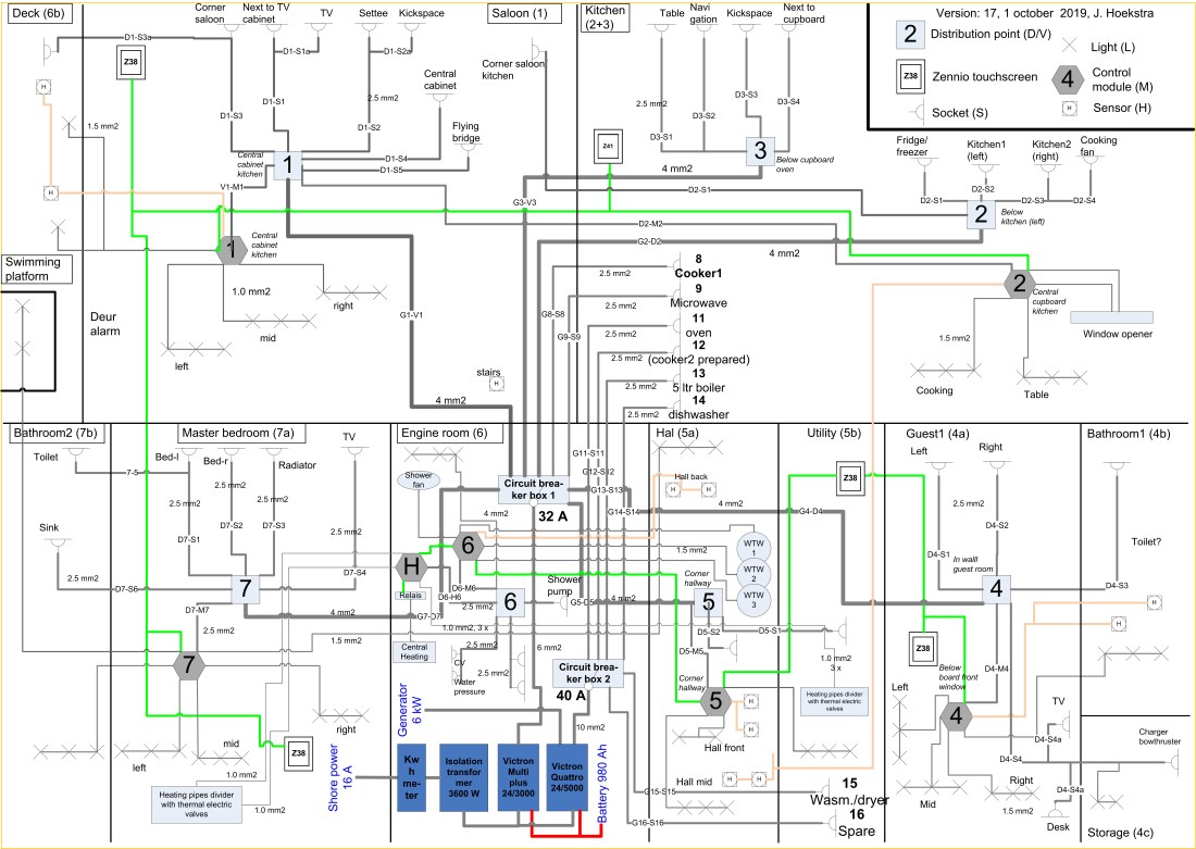 Links op de foto zie je onder de keuken door, de 230 V kabels in de grijze koker die uit de motorruimte komen. Ze zijn keurig 10 cm gescheiden van de 24 V kabels in de witte kokers, die vanaf het keukenpaneel komen. Maar iets daarvoor komt er kabelspaghetti onder het keukenpaneel uit, zoals je op de volgende foto ziet. Het lijkt wat onoverzichtelijk, maar aan de ene kant zijn de kabels vrij goed herkenbaar: de KNX kabels zijn groen, alle stuurstroom kabels zijn grijs, de NMEA2000 backbone kabel zijn ook grijs, maar een geheel ander type, de 24 V kabels zijn rood en zwart en op dit punt lopen geen 230 V kabels. Ook is het einde van de kabels gelabeld of is er een label aangebracht op de elektrische module of apparatuur. Bovendien is alles gedocumenteerd zoals je in de schema’s hier boven ziet. Mocht er een storing zijn, dan zijn de kabels goed te volgen.