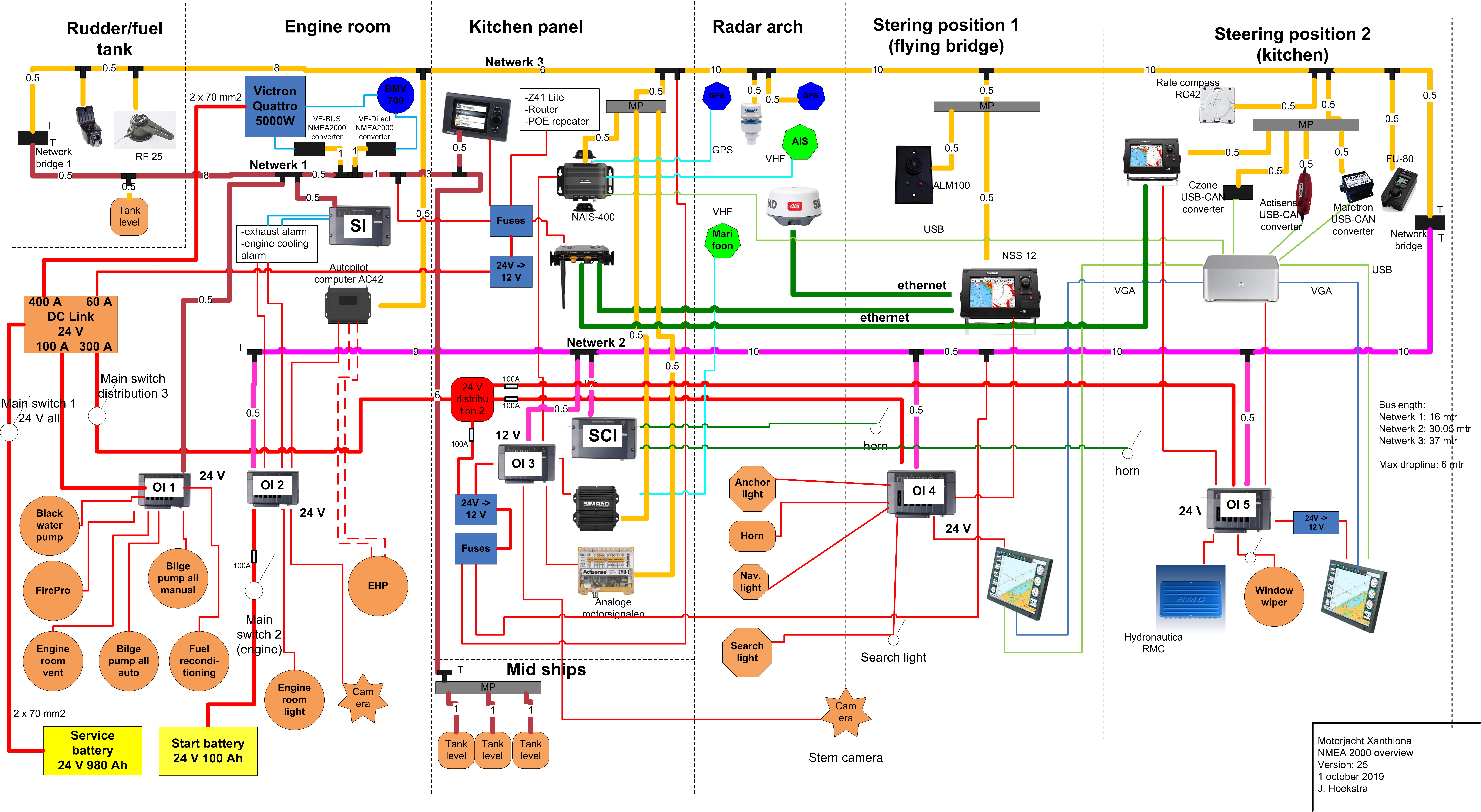 Bij het begin van de afbouw van ons motorjacht Xanthiona had ik me heilig voorgenomen om de gehele bedrading van de 24 V, de 230 V en voor de apparatuur en instrumenten heel precies en netjes volgens de regels van de kunst aan te leggen. Leidraad waren de ISO standaarden voor de DC stroom ISO 10133 (24 V gelijkspanning) en AC stroom ISO 13297 (230 V wisselspanning). Het 24 V systeem is gebaseerd op het principe van het Czone ‘distirbuted power system’‘, waarbij slechts 1 dikke kabel naar een verdeelpunt (output module) loopt waar dan de lokale stroomverbruikers met korte kabels worden aangesloten. De Czone modules zijn onderling verbonden met een NMEA2000 network en met behulp van een Czone display of Czone software kan men dan digitaal apparatuur aan en uit schakelen. Er zijn 5 output modules geinstalleerd op de volgende locaties: motorruimte (2 x), stuurpositie flying bridge, keukenpaneel en de (nood)stuurpositie in de keuken. Op deze manier van een ‘distributed power system’ voorkomt men dikke kabelbomen en door de eenvoud en overzichtelijkheid van het systeem is storing zoeken eenvoudig. Zie voor wat meer achtergrond o.a. de volgende artikelen op dit weblog: Update elektrische schema’s, Xanthiona nu digitaal bestuurd en Eerste proefvaart na upgrade. Zie ook hieronder de laatste update van het 24 V/NMEA2000/Czone schema.