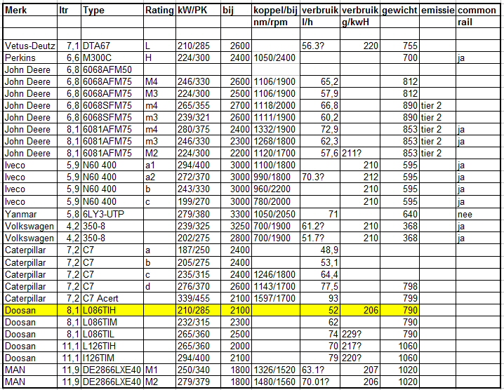 Achtereenvolgens heb ik gesproken met een Yanmar, Iveco, John Deere en Caterpillar dealer. Tijdens de Hiswa vorig jaar had ik al eens met Steyr en Volkswagen gesproken. Elke motor heeft zijn voor- en nadelen en worden door de dealers warm aanbevolen. Aan mij om een keuze te maken.