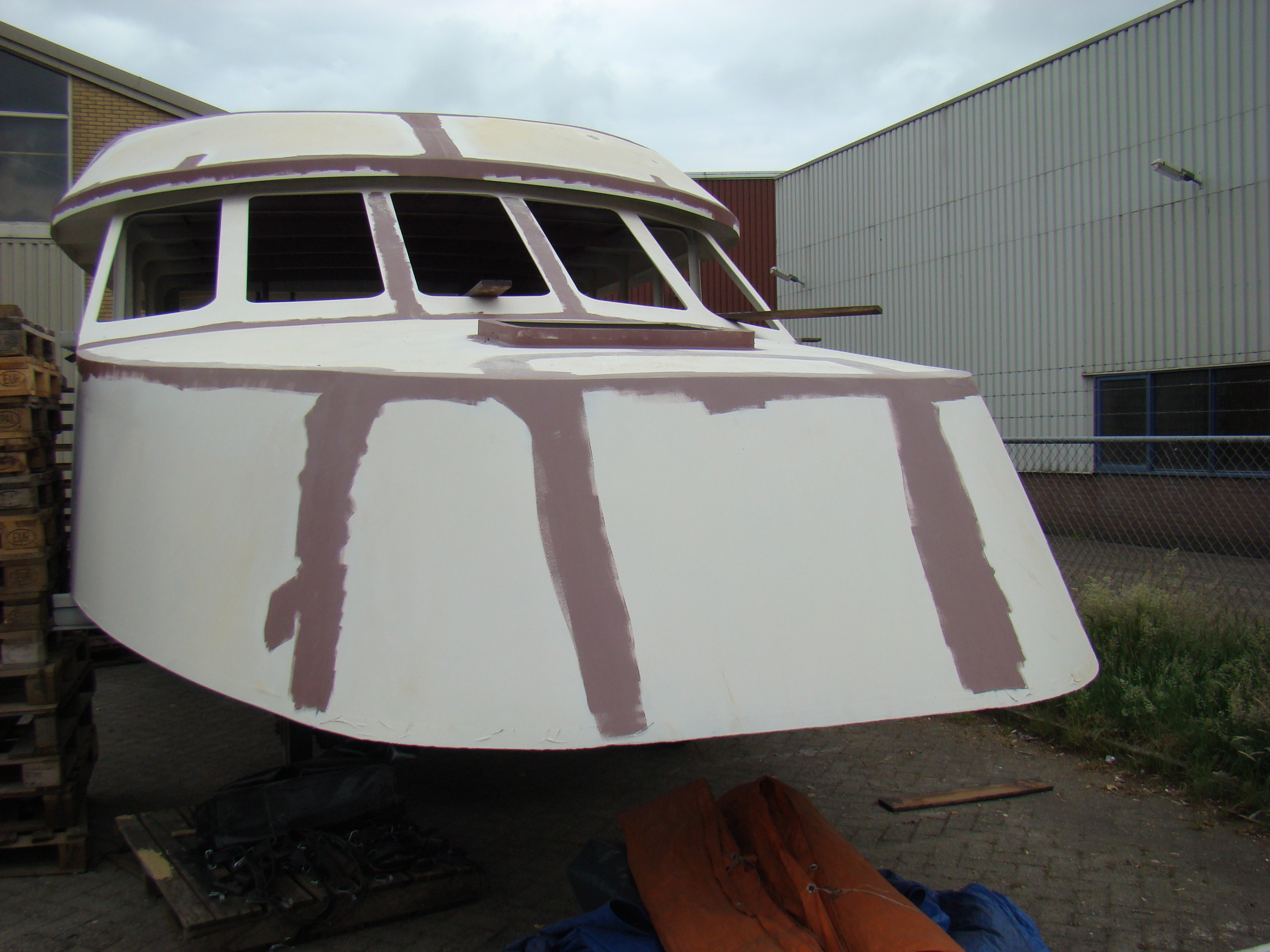 Het plamuurwerk van de opbouw van ons motorjacht Xanthiona is bijna klaar, zie foto. Meijer Boot Service voert het plamuurwerk uit, het ziet er allemaal mooi glad uit.