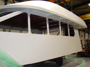 Op advies van Martin Pomp van MarHen Yachting wordt de opbouw momenteel deels geplamuurd. Aanvankelijk dacht ik dat het laswerk allemaal zo precies zou zijn dat plamuren niet noodzakelijk zou zijn. Nu de eerste primer er op gespoten is en alles 1 egale kleur is zie je de overgangen tussen de staalplaten meer dan ik had gehoopt. Na het lassen worden de naden glad geslepen en dat blijf je toch enigszins zien. Dus momenteel staat de opbouw ‘geparkeerd’ in de buurt van de werf en wordt door een specialist alle lasnaden en overgangen mooi glad gemaakt.