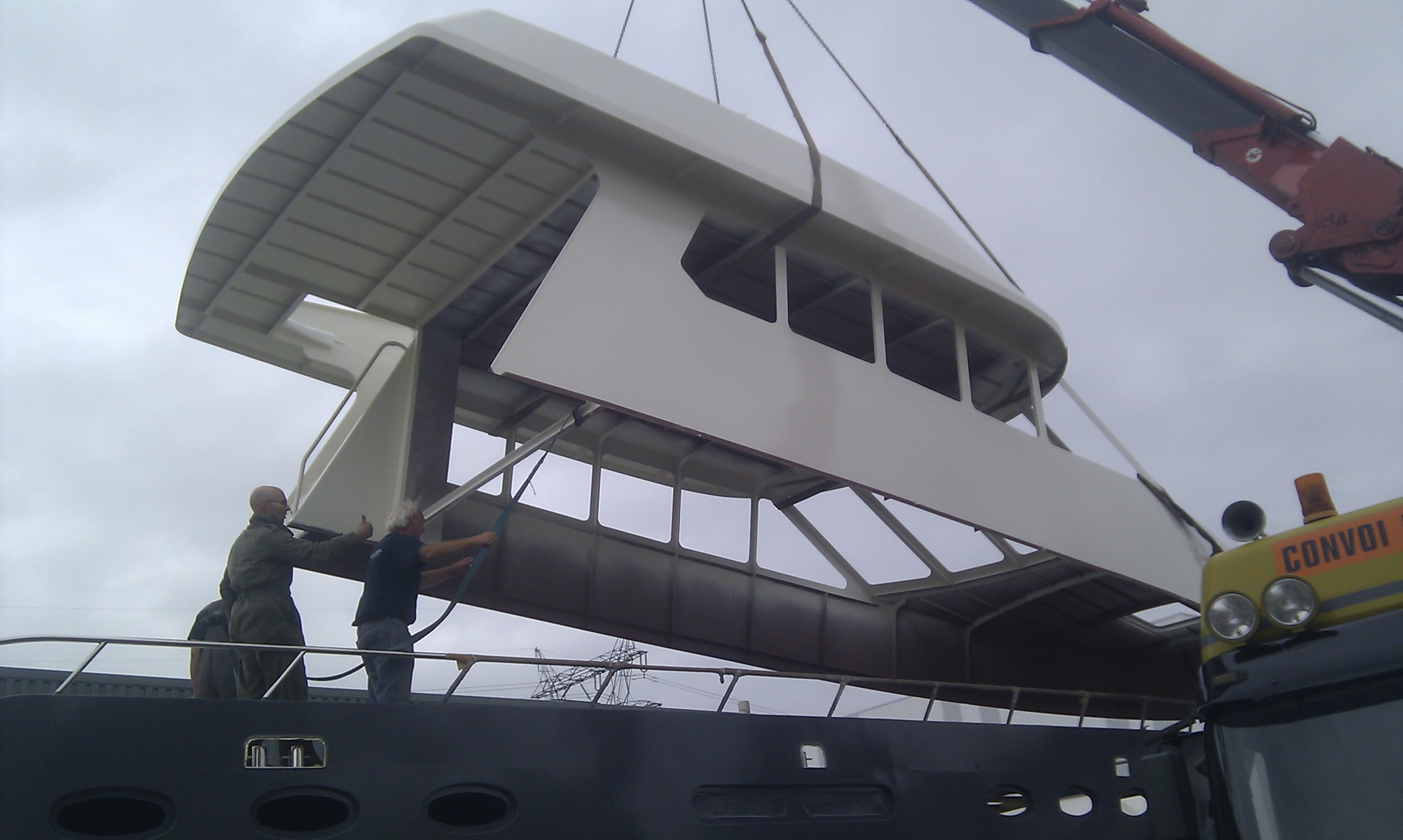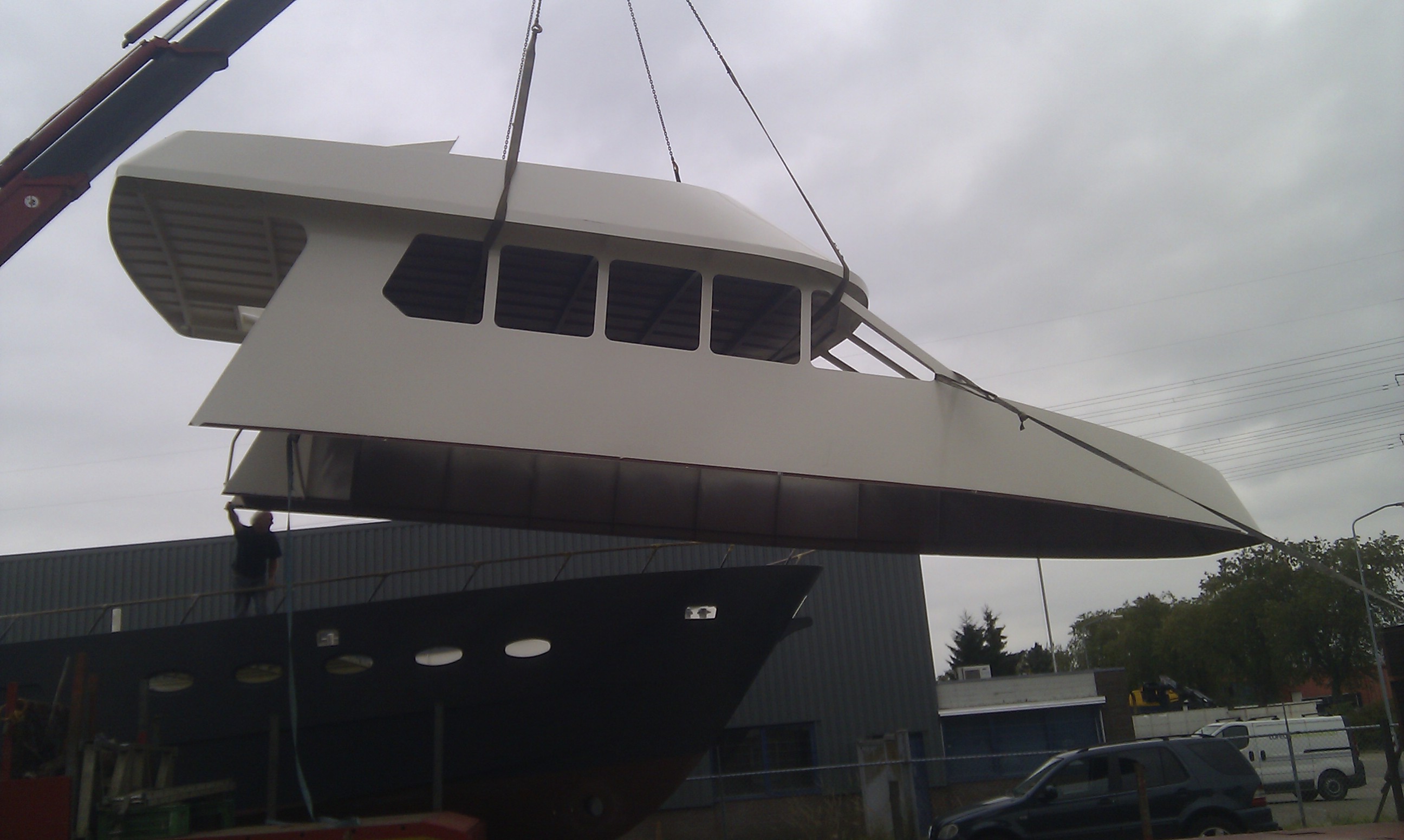 Op woensdag 21 September 2011 is de Xanthiona eindelijk een volwaardig schip geworden. De opbouw is een week eerder dan door MarHen Yachting aangegeven, op de romp geplaatst. Woorden komen te kort hier, de foto’s zeggen genoeg.