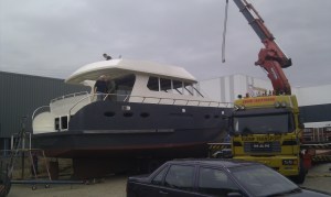 Na 13 maanden is ons motorjacht Xanthiona, een Almarine 1700, (eindelijk) te water. Op 1 oktober 2010 begon de bouw van de Xanthiona bij MarHen Yachting. Op dit weblog kun je lezen hoe de bouw de afgelopen maanden is verlopen. Uiteindelijk 6 maanden later dan gepland is de Xanthiona afgelopen woensdag 26 oktober te water gegaan. Een groot deel van de vertraging werd veroorzaakt door de verlate levering van de Doosan L086TIH motor, de overige vertraging is de min of meer normale uitloop die ontstaat door het tegenzitten van werk, materiaal, etc.