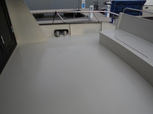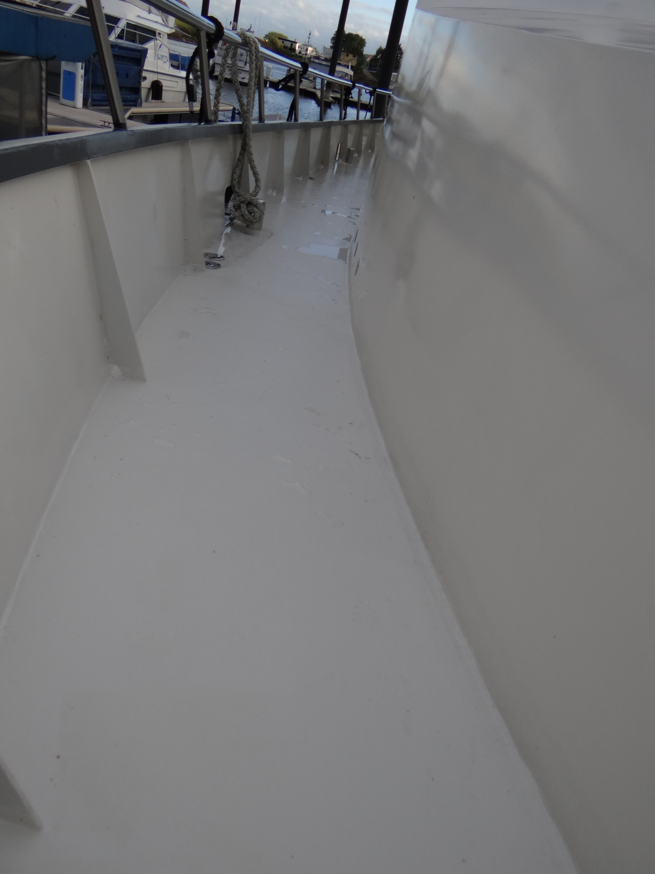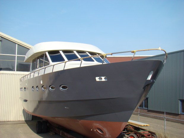 Vorige week zondag was mooi weer voorspeld en dus ben ik ’s ochtends laat maar naar Duitsland gereden om het gangboord te schuren en te verven. De dag erop kon ik voordek nog net voor donker schuren en verven. Het achterdek had ik 2 week geleden al gedaan. Ook de flying bridge en de trap naar de flying bridge was al eerder gedaan. Al met al heb ik er nu zo’n 6 weken tijd in zitten, die dus niet aan het interieur zijn besteed. Maar goed, ik wil dat ook de buitenzijde er goed uitziet.