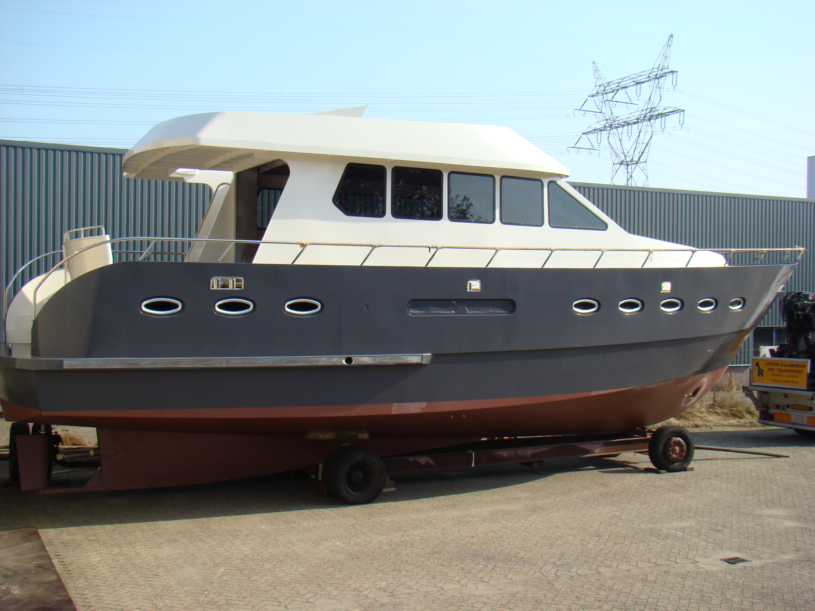In de middag kwam men van het schildersbedrijf nog enige lichte aanslag in de grijze lak van de romp weg poetsen. Tussen de bedrijven door had ik nog bij Andringa Reklame en Belettering geregeld dat in de loop van de middag de naam op beide zijden van de boeg en de achterkant werd aangebracht. Ondertussen was Meijer Boot Service bezig met het voorbereiden van het instrumentenpaneel. Al met al genoeg hulp om de Xanthiona zo ver te hebben dat zij (boten schijnen vrouwelijk te zijn) dinsdagavond over de weg naar de haven gaat en daar woensdagmorgen in het water wordt getild.