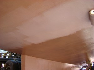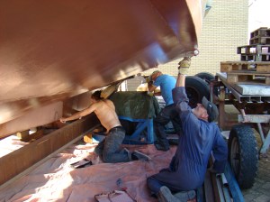 De taktiek die we hebben gebruikt is: 1 persoon begint bij de boeg, de ander aan het achterste eind en je werkt naar mekaar toe. Tegen de tijd dat je bij elkaar bent is de eerste aangebrachte Coppercoat nog niet droog en kun je dus weer met de volgende laag beginnen. Dit 4 keer achter elkaar en je hebt 1 kant klaar. Mocht het nou allemaal te laat worden, dan kun je altijd besluiten de andere kant de volgende dag te doen.