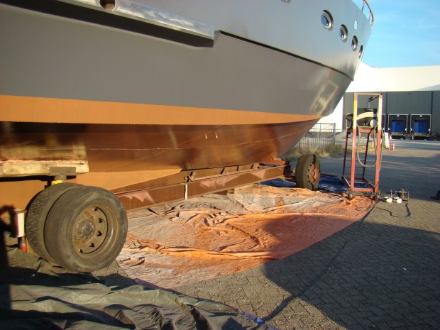 Nog 3 lagen primer op het onderwaterschip motorjacht Xanthiona