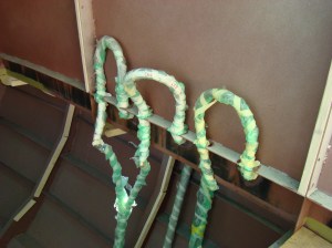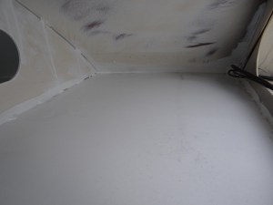 Terwijl ik aan de onderkant werkte, werd er binnen door een professioneel isolatiebedrijf in alle ruimtes ca. 5 cm PUR-isolatie gespoten. In de week ervoor was het hele jacht voorbereid en van binnen alles afgeplakt door Marhen Yachting. Letterlijk alles werd afgeplakt. De jongens van het isolatiebedrijf waren erg enthousiast over hun produkt, met deze vorm van isolatie haal je een isolatiewaarde van 2.2. Overigens als je het er nog dikker opspuit levert dat achteraf veel werk op omdat je dan weer delen moet wegsnijden om de betimmering aan te brengen, bovendien gaat de isolatiewaarde daar maar een klein beetje mee omhoog, tot 3.0. Aldus de experts. Foto komt nog.