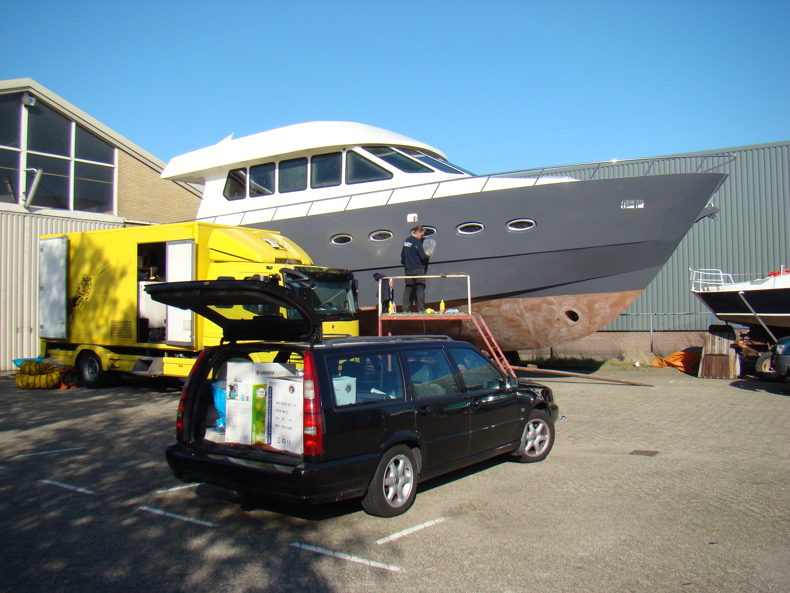 Met man en macht werken aan motorjacht Xanthiona