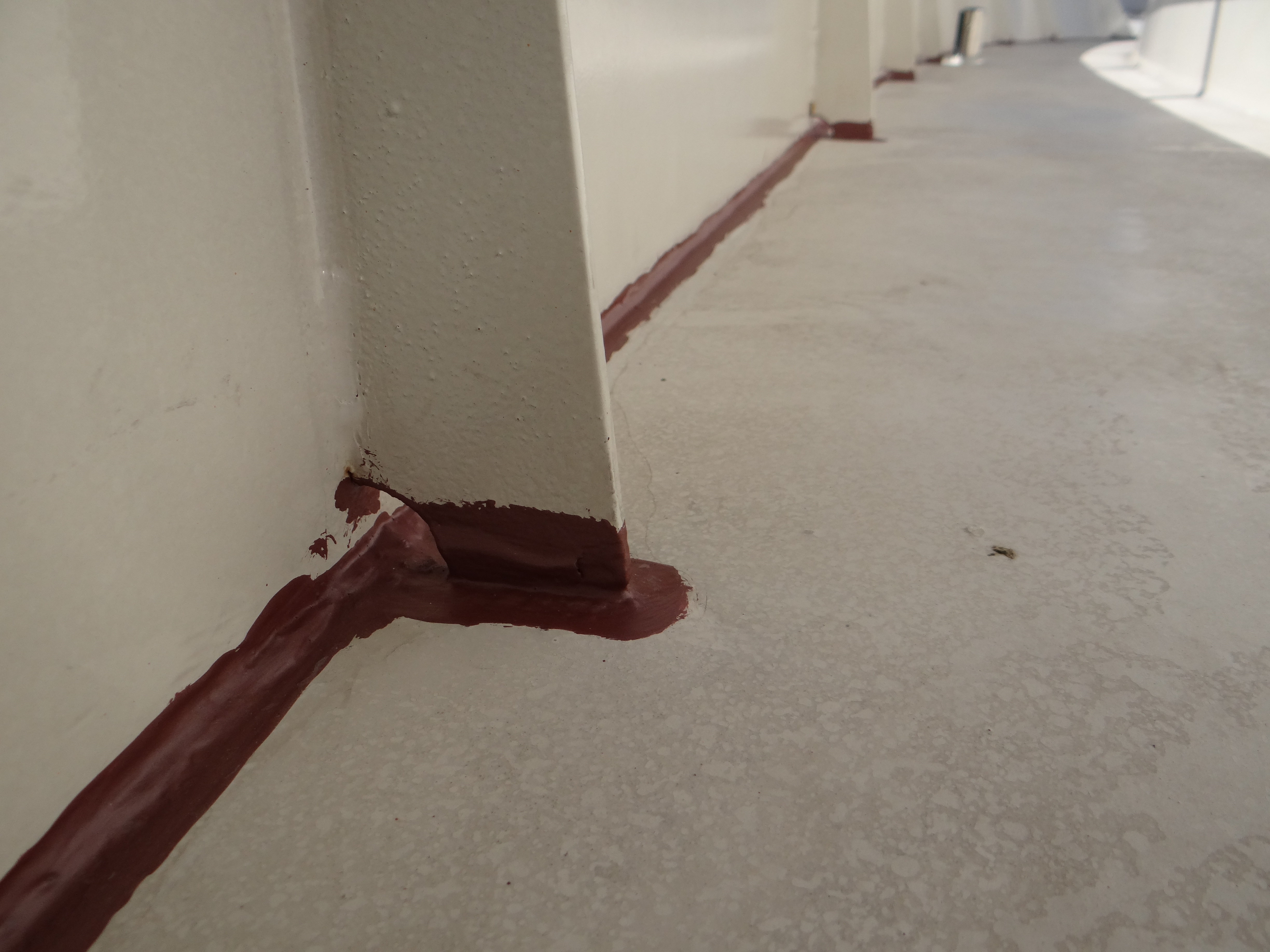 Ons motorjacht Xanthiona is voor een flink bedrag door een professioneel bedrijf gespoten met kwaliteitsverf, helaas is de eerste roestvorming zichtbaar. Niet op de plaats waar gespoten is, maar vooral daar waar niet gespoten is. Er zijn enkele plaatsen niet goed in de verf gezet en daar begint nu de roest. Tijd om het bij te werken. Daar ben ik inmiddels al enkele avonden mee bezig. Langs de randen van het boeisel en waar de spanten het dek raken is eerst goed ontroest en daarna is 2 lagen 2-componenten primer aangebracht en dan 2 lagen 2-componenten International verf. De rand langs het boeisel is een rand waar wel vaak wat water in blijft staan. Met de behandeling is hopelijk het staal nu voldoende beschermt.