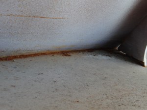 Op de flying bridge was er met name onder de ronding aan de voorzijde te weinig verf aangebracht in de hoeken en aan de onderzijde (hier is ook moeilijk bij te komen). De oplossing was er in te kruipen, de boel te ontroesten en dan verf er op. Makkelijk gezegd maar de ruimte is klein, dus liggend, half op de ellebogen steunend, op je rug, dan weer op je buik, een stukje met de linker hand, dan een stukje met de rechterhand, dan deels boven het hoofd schilderen, weer even omdraaien, weer en stukje en zo moest de klus worden geklaard. Ik heb er nu 2 lagen metaalverf op gedaan die rechtstreeks over roest kan. Kijken of dit goed werkt.