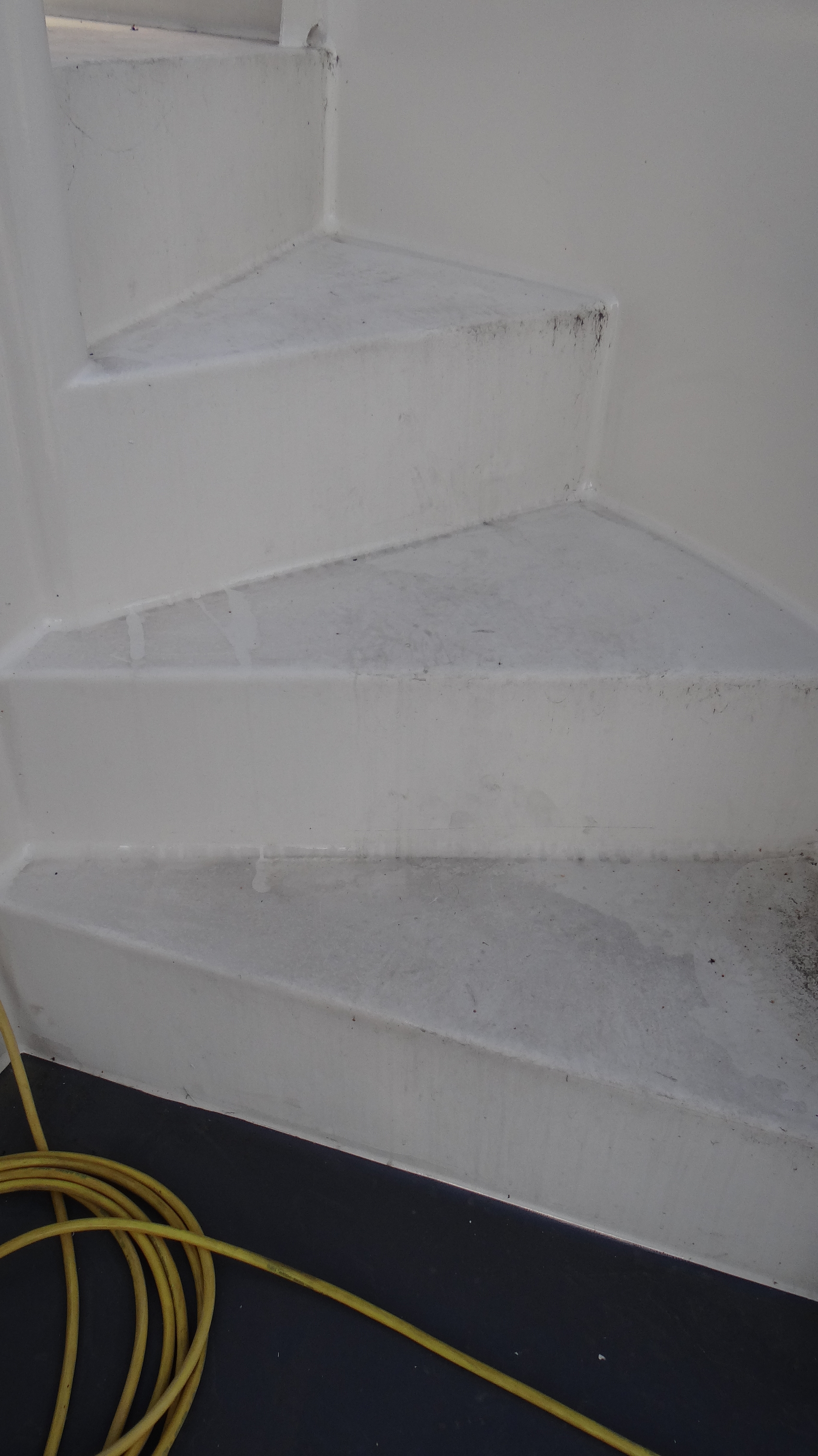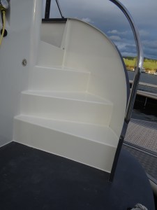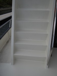 Gisteren schreef ik over de slechte staat van het gangboord en het dek. De trappen naar het zwemplateau zagen er ook slecht uit, die hadden dan wel niet zo’n zachte toplaag, maar mooi was het zeker niet. Vandaag de stuurboord trap nog even gedaan, de bakboord en de trap naar de flying bridge hadden 2 week geleden al een opfrisbeurt gehad.