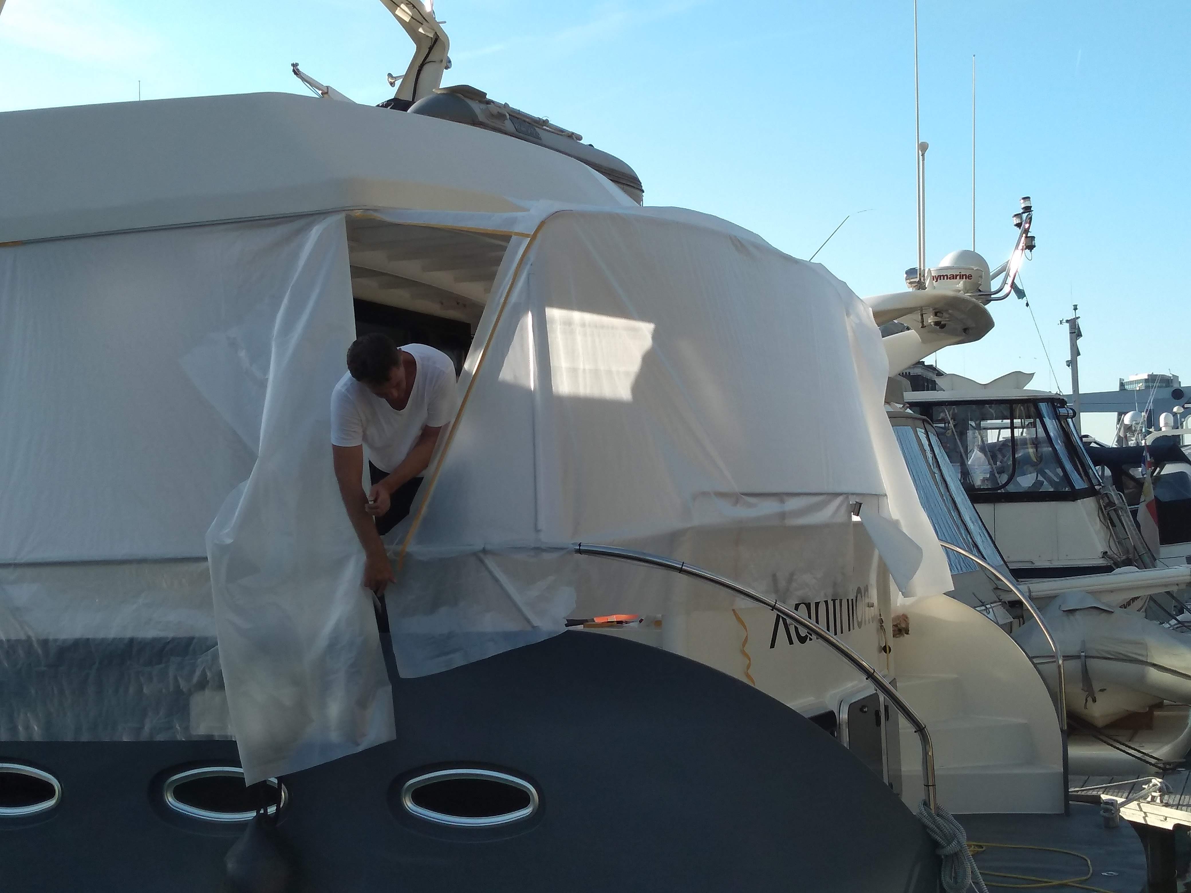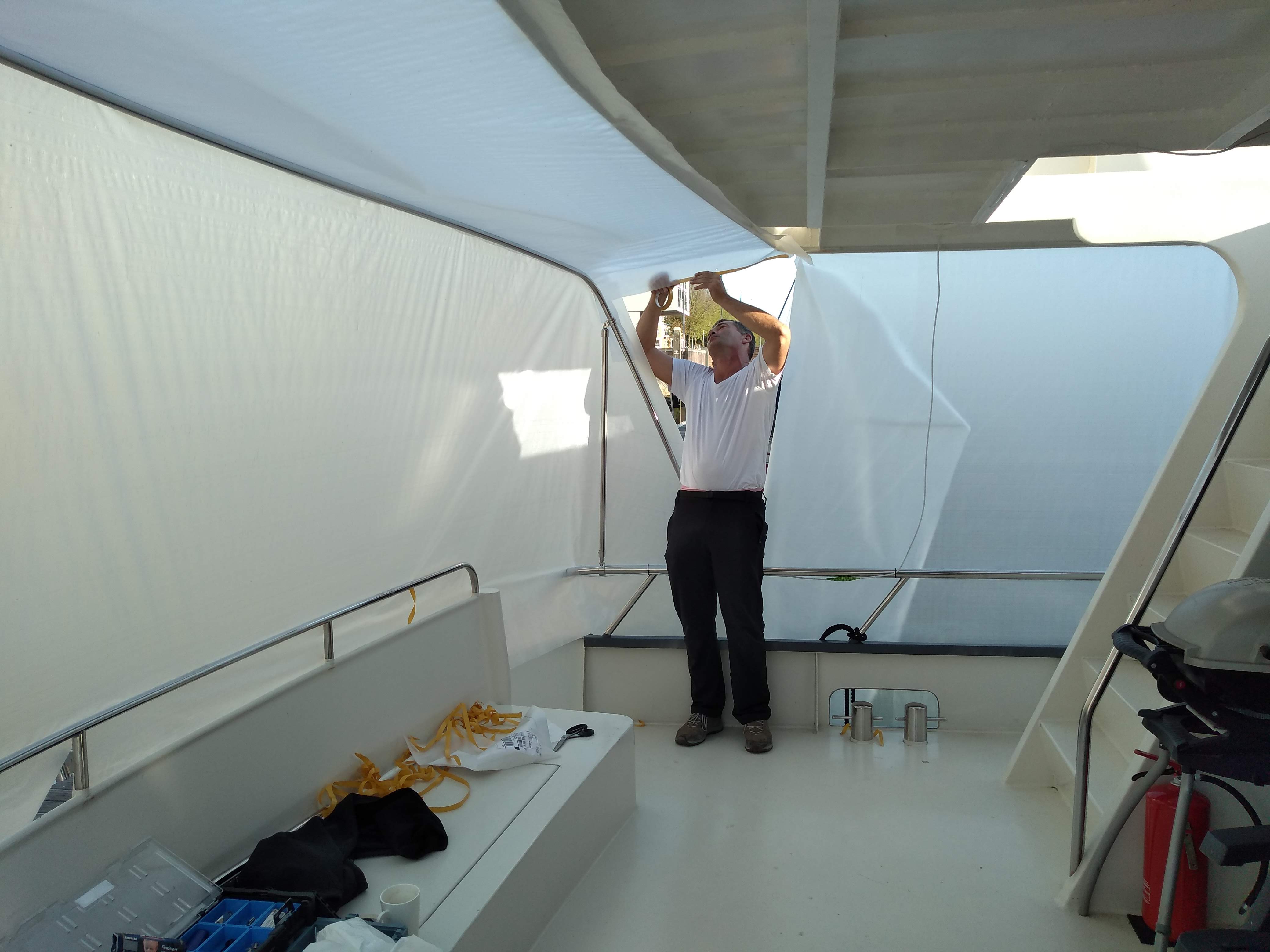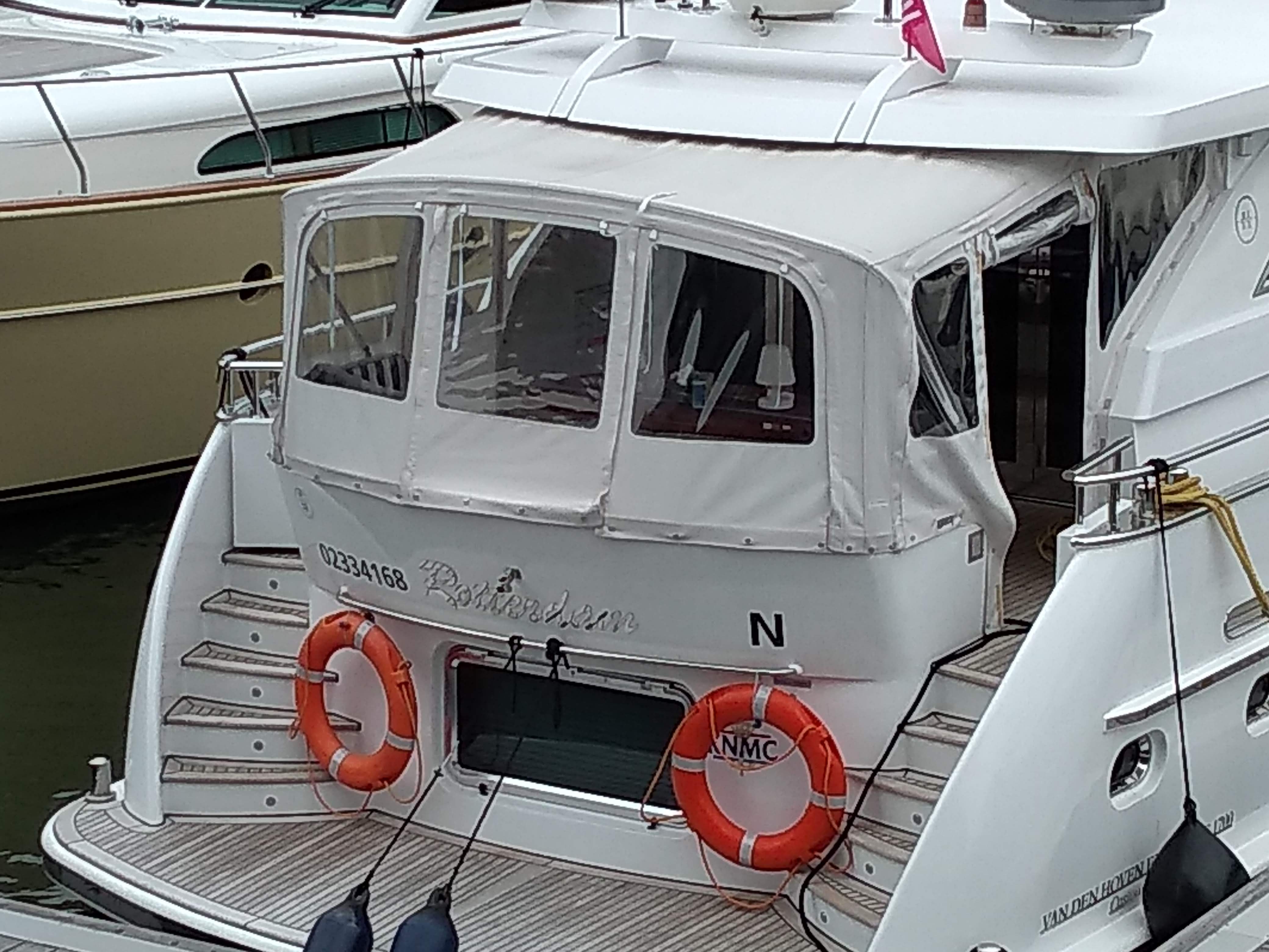 Gezwicht voor de argumenten van het gezin, is Zeilmakerij Vermeer benaderd voor de mogelijkheden. Er waren 2 opties; een smalle tent waarbij de trappen van het zwemplateau en de doorgang naar voren vrij blijven, zie voorbeeld foto. Er werd gekozen voor optie 2 met een tent over de volledige breedte van het achterdek.