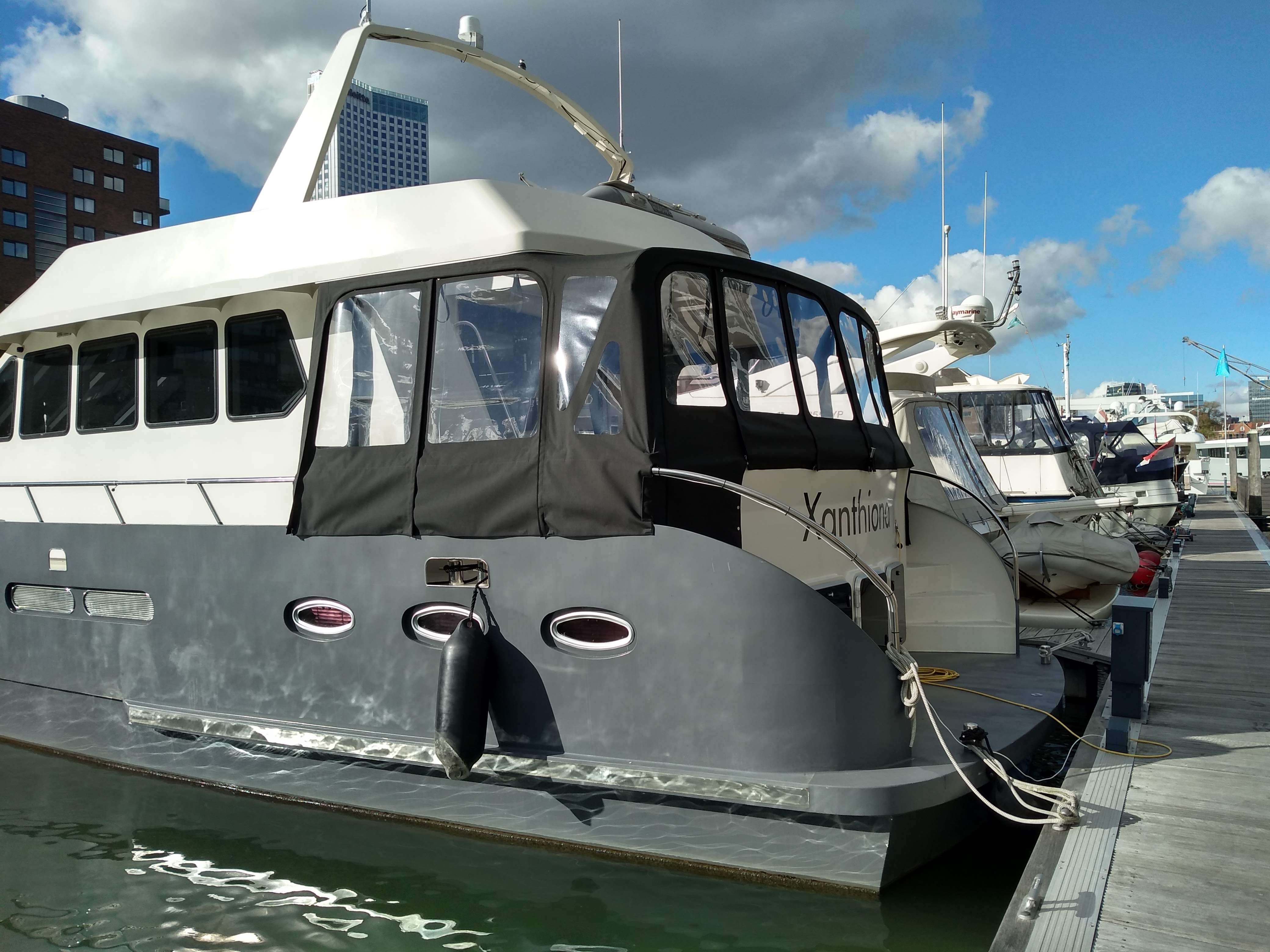 Uitgebreide discussies hebben we gehad over wel of niet een tent op het achterdek van ons motorjacht Xanthiona. Voordelen volgens het gezin: veel extra ruimte, meer schaduw tijdens zomerse dagen en het achterdek blijft droog (waardoor de 10 volumineuze kussens van de bank niet naar binnen hoeven). Nadelen volgens de eigenaar: delen van de tent zitten in de weg bij het aanmeren en het ziet er niet uit: de achterkant van de Xanthiona vind ik qua lijnenspel fraaier dan de voorkant.