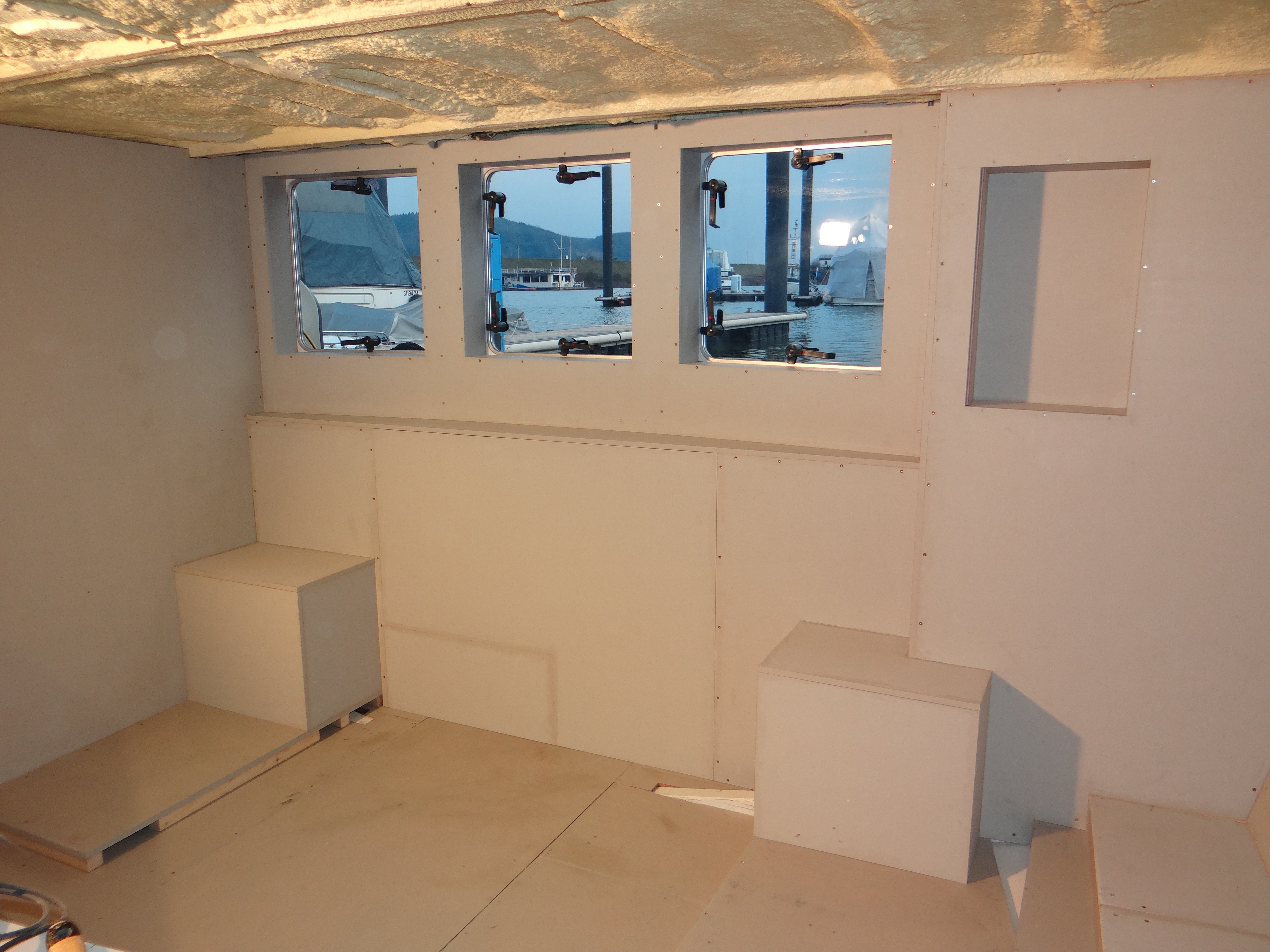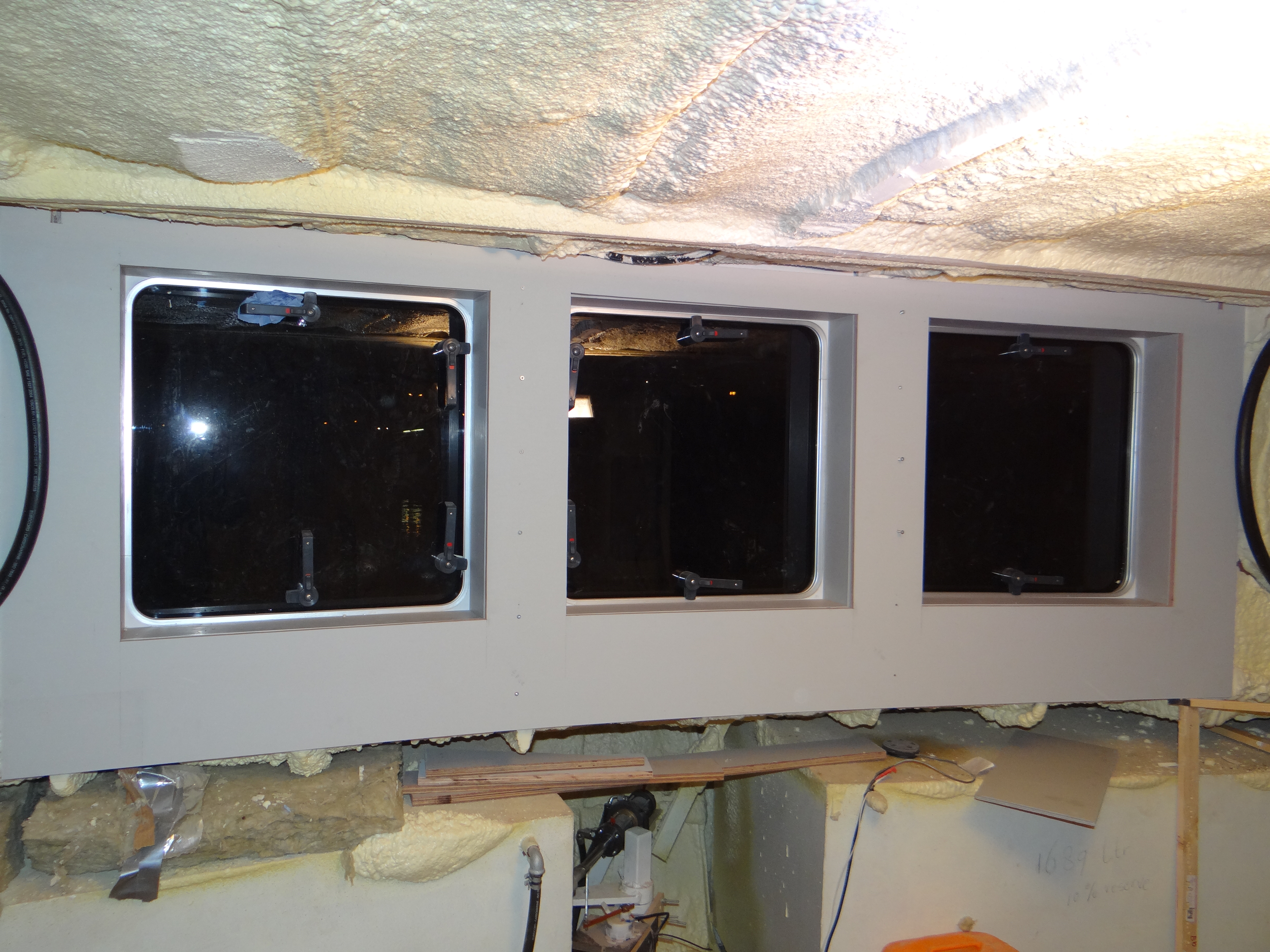 Voordat ik de wandplaat aanbreng moet ik nog wel oplossen hoe ik het allemaal ga doen rondom de patrijspoorten. In juli schreef ik hier over: Advies: begin met de patrijspoorten/. Nu ben ik er uit hoe ik het ga doen. Eerst inderdaad 10 mm kurk op het staal waarin de patrijspoort bevestigt is. Dan een 15 mm uniprime plaat waarmee het geheel dan vlak komt met de voorste rand van de patrijspoort en waardoor vooral het condens probleem wordt verminderd. Daarom heen komt een vierkante lijst waarop dan de uiteindelijke wandplaat weer aansluit. Ik zorg boven en links en rechts voor wat extra ruimte. Hiermee onstaat er een koof rondom die het bovenste gedeelte en de zijkanten van de luxaflex verbergt. Komende week hoop ik de hele wand af te maken.