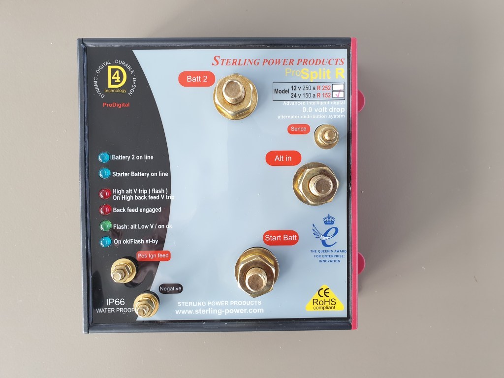 Maar de dynamo laad normaliter de startaccu van de motor op en niet de service-accu, hoe regel je dat dan? Hiervoor gebruik je een zogenaamd Voltage Sense Relais (VSR) of een diodebrug. De relais zijn er van een aantal fabrikanten en zodra de startaccu een bepaald voltage bereikt, meestal 26.4 V, dan wordt door het relais de service-accu paralel geschakelt en wordt deze ook door de dynamo geladen. Op de Xanthiona had ik al een VSR, maar ik had mijn twijfels of deze wel goed werkte, gezien de slechte ervaring van het laden tijdens het varen in de zomervakantie. In ieder geval kwam ik tijdens het internet onderzoek tegen de Sterling Power Alternator Splitter Pro Split R, een intelligent relais dat ook de service-accu bijschakelt. Bij Sterling Power ontdekte ik ook het bestaan van de Universal Advanced Digital Alternator Regulator Pro Reg DW een intelligente laadstroomregelaar.