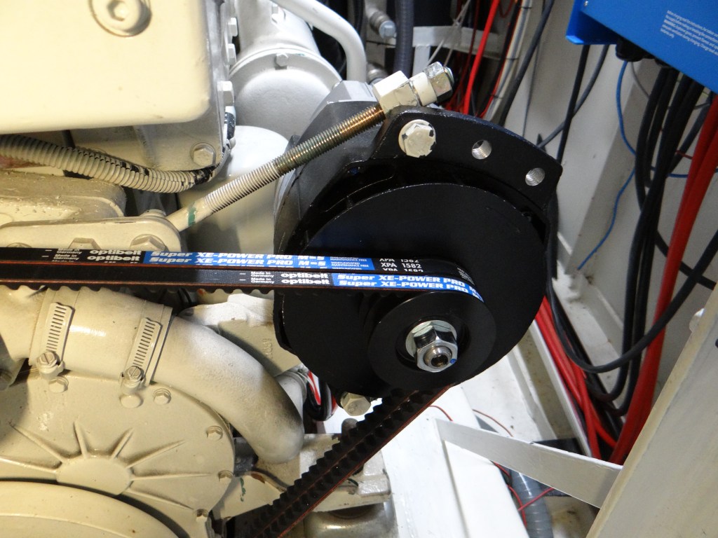 Door het vervangen van de dynamo moest er ook een iets langere V-snaar worden gebruikt. Inmiddels heb ik geleerd dat de lengtes van de V-snaren volgens ISO standaarden worden aangegeven. Ook is er voor een V-snaar een minimale diameter van de poelies bepaald, in relatie tot de buigzaamheid van de snaar. Met de Optibelt Extreme Power XPA 1582, met een lengte van 1582 mm, kan tot minimaal een poelie van 73 mm diameter worden gebruikt. De poelie van 78 mm is dus OK. Het monteren van de dynamo was niet zo moeilijk. Het aansluiten van de bedrading van laadstroomregelaar en splitter is echter wel een secuur werkje, goed de handleidingen lezen en geen fouten maken. Schakel een expert in als je twijfelt.