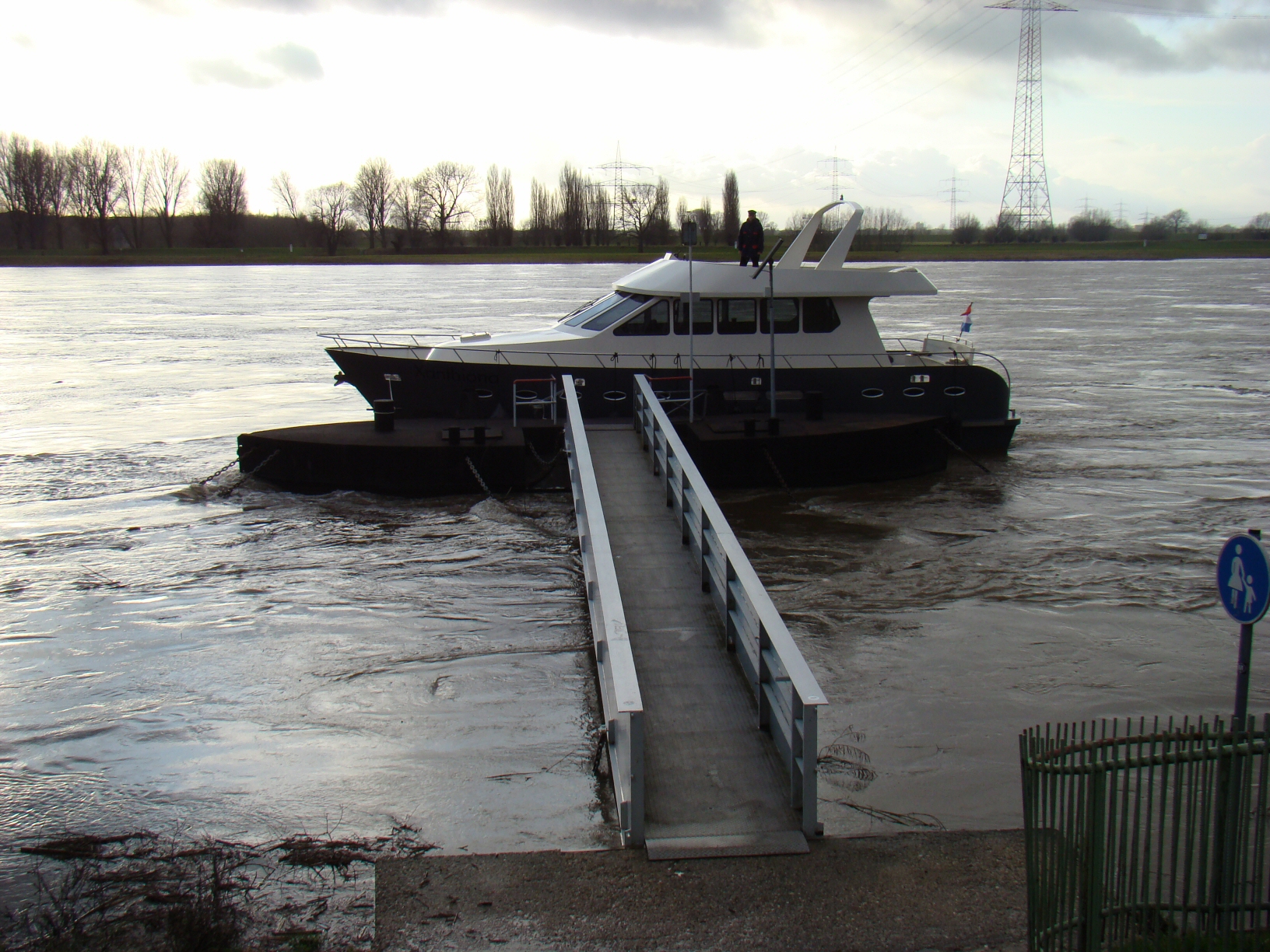 Goede raad was duur, ik durfde het risico niet te nemen om verder te gaan, stel dat de wierpot weer vol komt te zitten of dat de geimproviseerde koppeling tussen de 2 uitlaatslangen het begeeft. De stroom is echt heel sterk en er was druk scheepvaarverkeer, je kunt daar niet te midden van dobberen of stil liggen. We hebben daar nog de hydraulische olie bijgevuld van de stuurpomp. Ik heb mijn motorboot varende collega Marc gebeld, die ons heeft geassisteerd om de Xanthiona met laag toerentaal terug te varen naar Düsseldorf. Daar liggen we nu (weer), maar nu met echte pech, die gevaarlijk had kunnen aflopen.