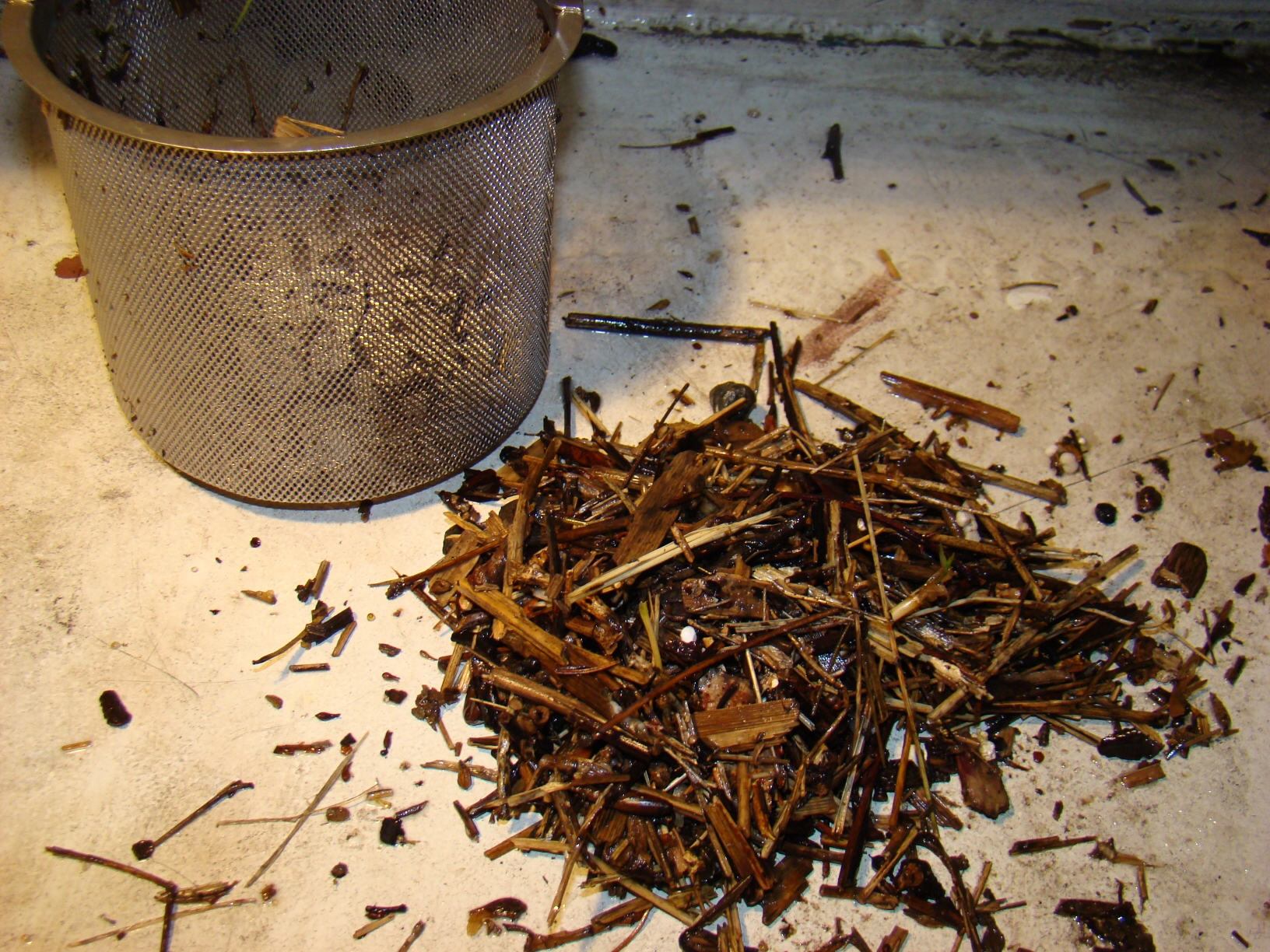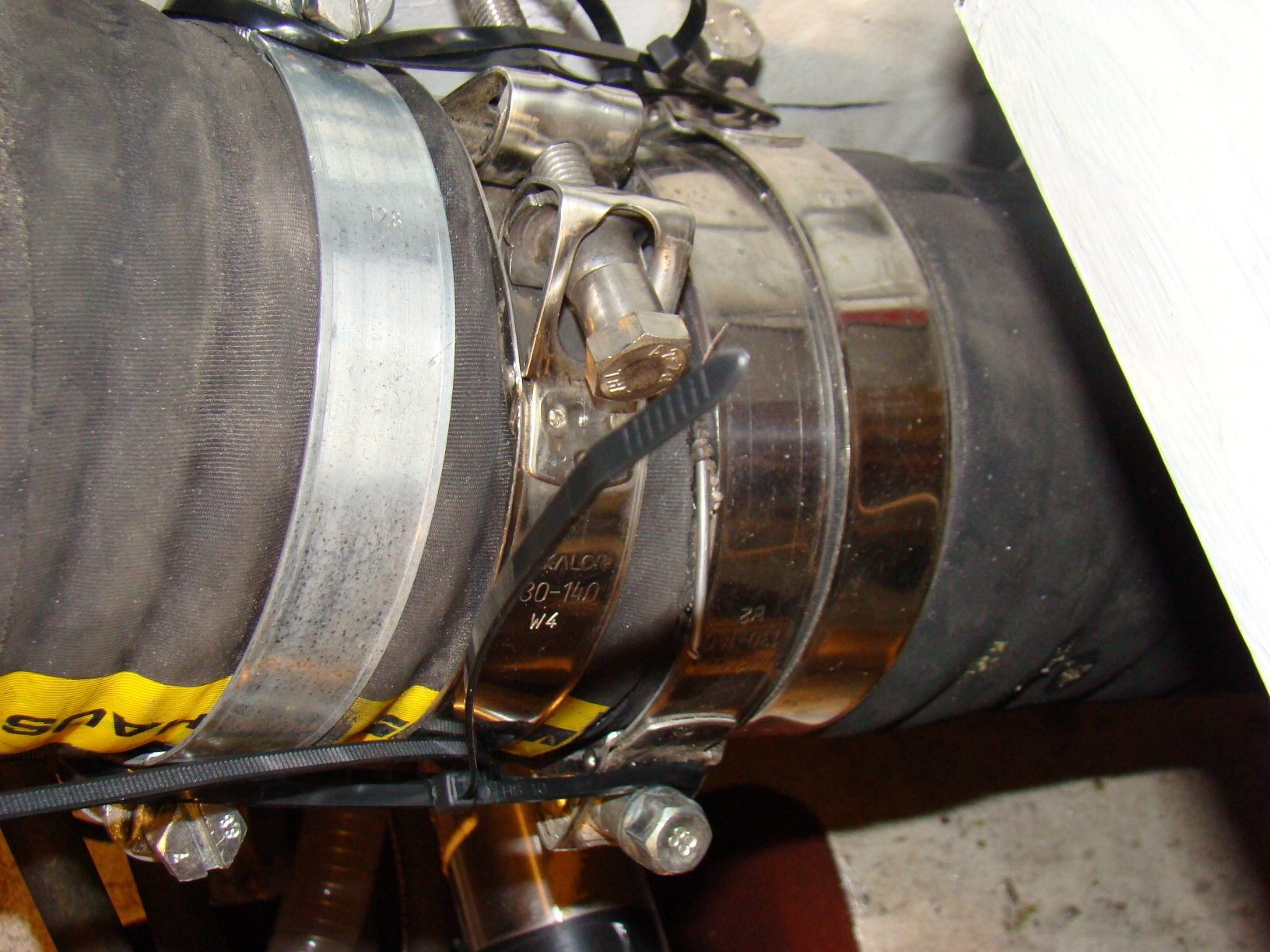 Op de foto’s zie je dat er behoorlijk veel zooi drijft en dat de wierpot flink vol komt te zitten, zelfs met vrij grote stukken troep/hout/takjes. Verder zie je de gesmolten waterlock en de geimproviseerde koppeling tussen beiden einden van de uitlaatslang. Nu eerst maar eens de zaak goed en degelijk repareren. De duitse schipper heeft aangegeven niet verder te willen gaan tenzij alles veilig is.