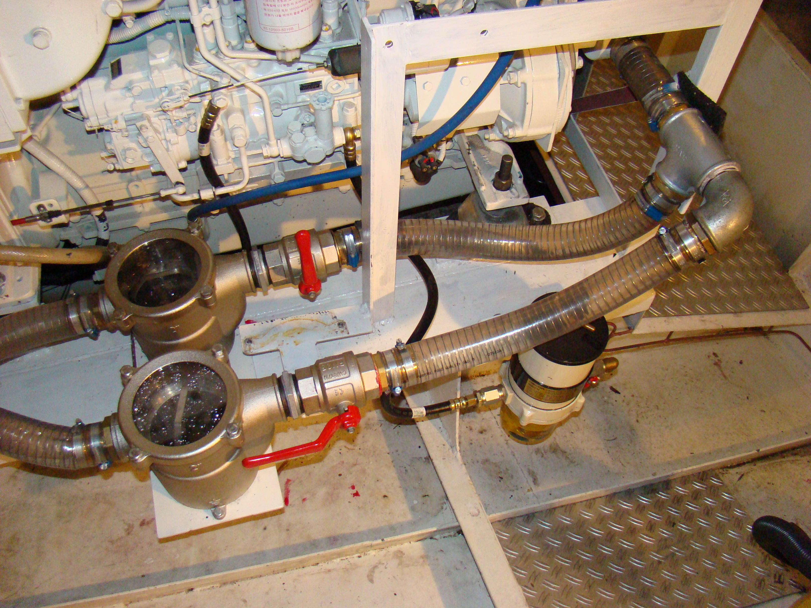 Volgens de schipper (een zeer ervaren rot in het vak van 71) en mijn collega moet je bij een enkele motor een dubbele wierpot hebben en bij voorkeur ook een dubbel brandstoffilter. Daarnaast moet je zeker als je een kunststof waterlock hebt een sensor op de uitlaat hebben die aangeeft dat ie te warm is en er geen water meer komt voor de koeling. Naar mening van beiden is de wierpot ook veel te klein, die zou minstens de dubbele afmetingen moeten hebben voor zo’n motor.
