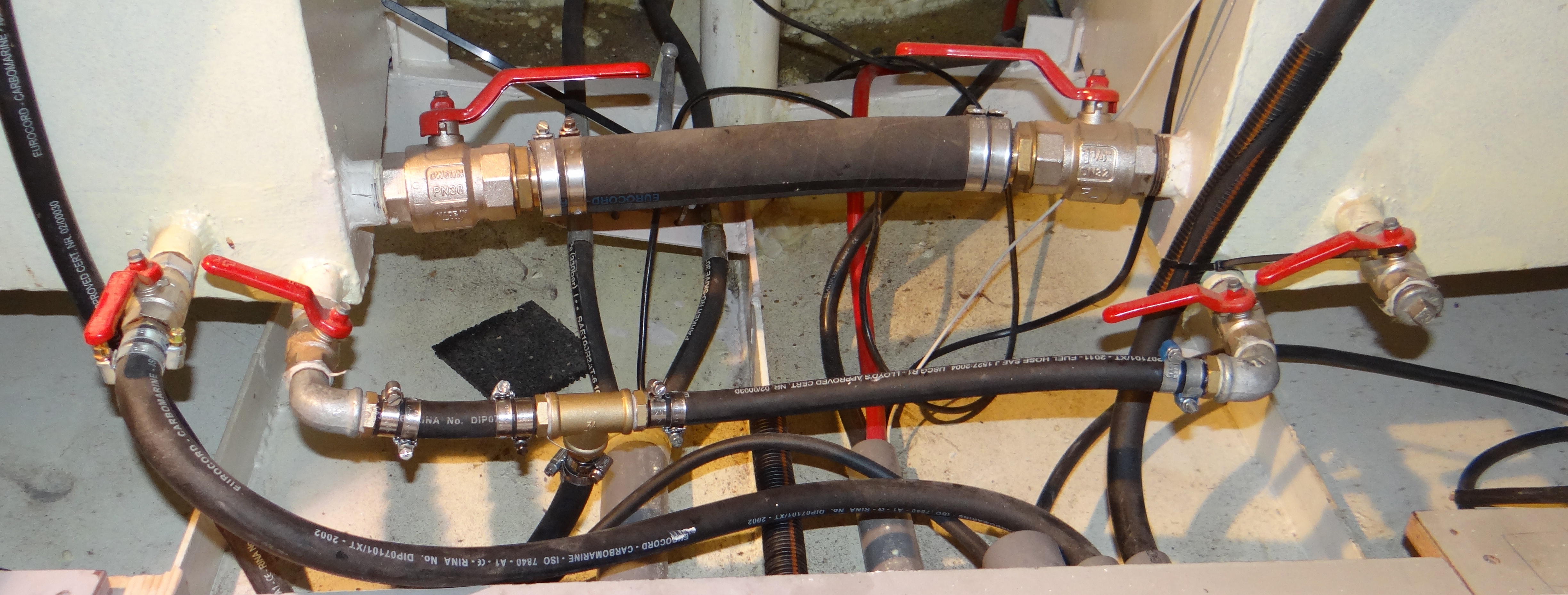 Na wat discussie over het nut van mangaten in de tanks om de tanks te kunnen reinigen, kwam ik ook hier tot de conclusie dat voorkomen beter is dan genezen. Voorkom dat er zich in de loop der jaren vuil ophoopt op de bodem van de tanks. Gelukkig is de bodem van beide tanks een beetje aflopend met een aftappunt op het laagste punt. Via een T-stuk zijn de beide aftappunten aan een enkele leiding gekoppeld naar het brandstofreinigingssyteem. Via de kranen bij de aftappunten kan om beurten na een tochtje over woelig water het systeem worden ingeschakeld. Eventuele vervuiling van de bodem die is gaan ‘zweven’wordt dan direct verwijderd. Door dit regelmatig te doen zou er geen noodzaak zijn voor mangaten in de tanks. De praktijk zal uitwijzen of dit op termijn misschien toch nodig zal zijn in het geval van erg sterke vervuiling. Essentie is voorlopig preventief vuil en water verwijderen uit de tanks.