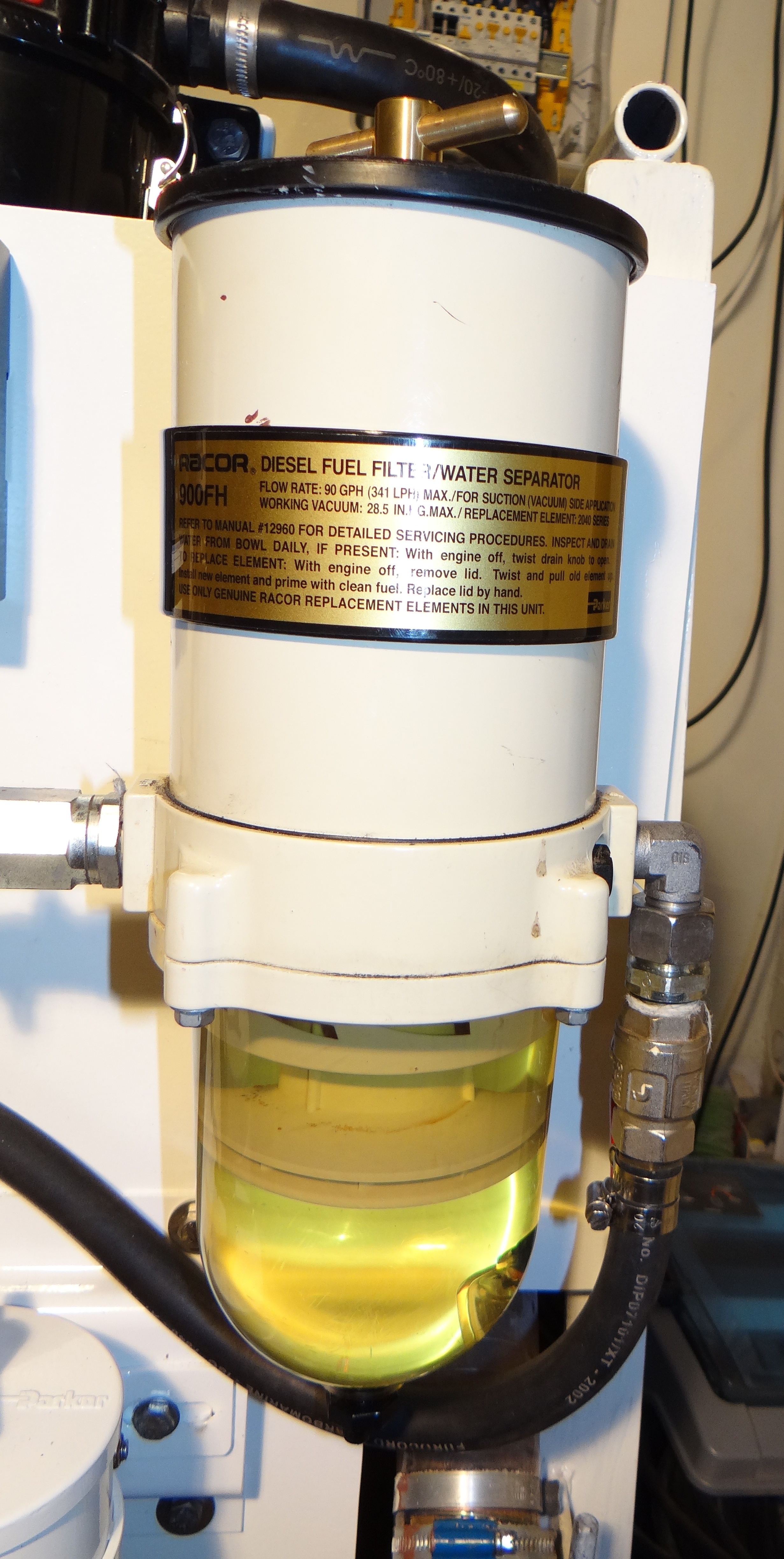 Terug naar de verbetering van het brandstofsysteem. Deel 1, het preventief en regelmatig reinigen van de brandstof van vuil en water is met het installeren van het (zelfbouw) brandstofreiningssysteem opgelost. Het 2de doel was om een dubbel brandstoffilter te installeren. Gecharmeerd van de geclaimde werking van de Racor Turbine brandstoffilter heb ik een Racor 75500MAX besteld in Engeland (200 € goedkoper). De MAX versie is de versie voor de watersport met de verplichte metalen kom aan de onderzijde voor de brandveiligheid. De 75500 heeft een lagere doorstroomhoeveelheid dan de 900 serie (227 liter/uur versus 341 liter/uur).