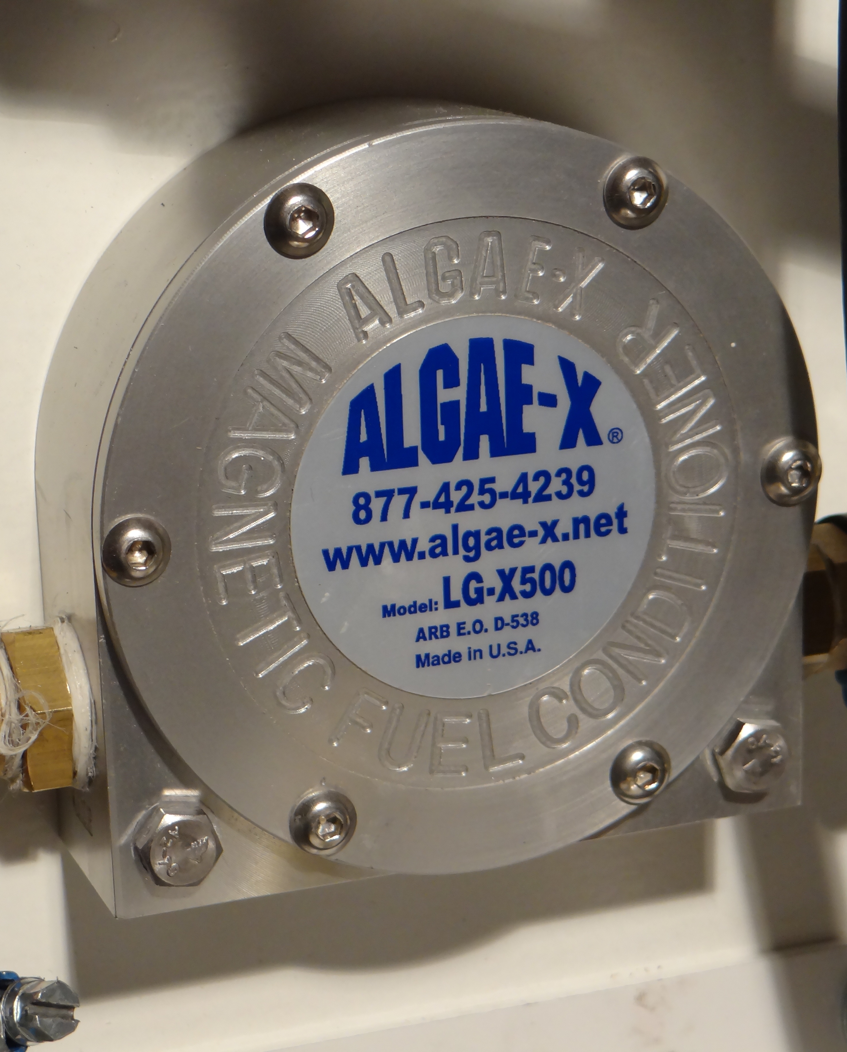 De knock-down magneet is volgens sceptici een mythe waarvan nooit is bewezen wat ie moet doen: het bestrijden van de micro-organismen. In allerlei Amerikaanse literatuur wordt geclaimd dat de magneet een bijzondere werking heeft en zorgt voor het (op den duur) bestrijden van de micro-organismen en ook zorgt voor schonere verbranding. Baat het niet dan schaadt het niet, dus de magneet wordt in het systeem opgenomen. Per toeval werd een nieuwe Algae-X magneet aangeboden op marktplaats voor een prettige prijs. Na wat zoeken op het internet werd een goedkope 24 V tijdklok via Ebay besteld en een Jabsco Gear Puppy brandstofpomp (13 ltr/minuut) by een online watersportwinkel. Samen met het bestaande Racor 900 MA brandstoffilter zijn dat de componenten van het brandstofreinigingssyteem voor de Xanthiona.