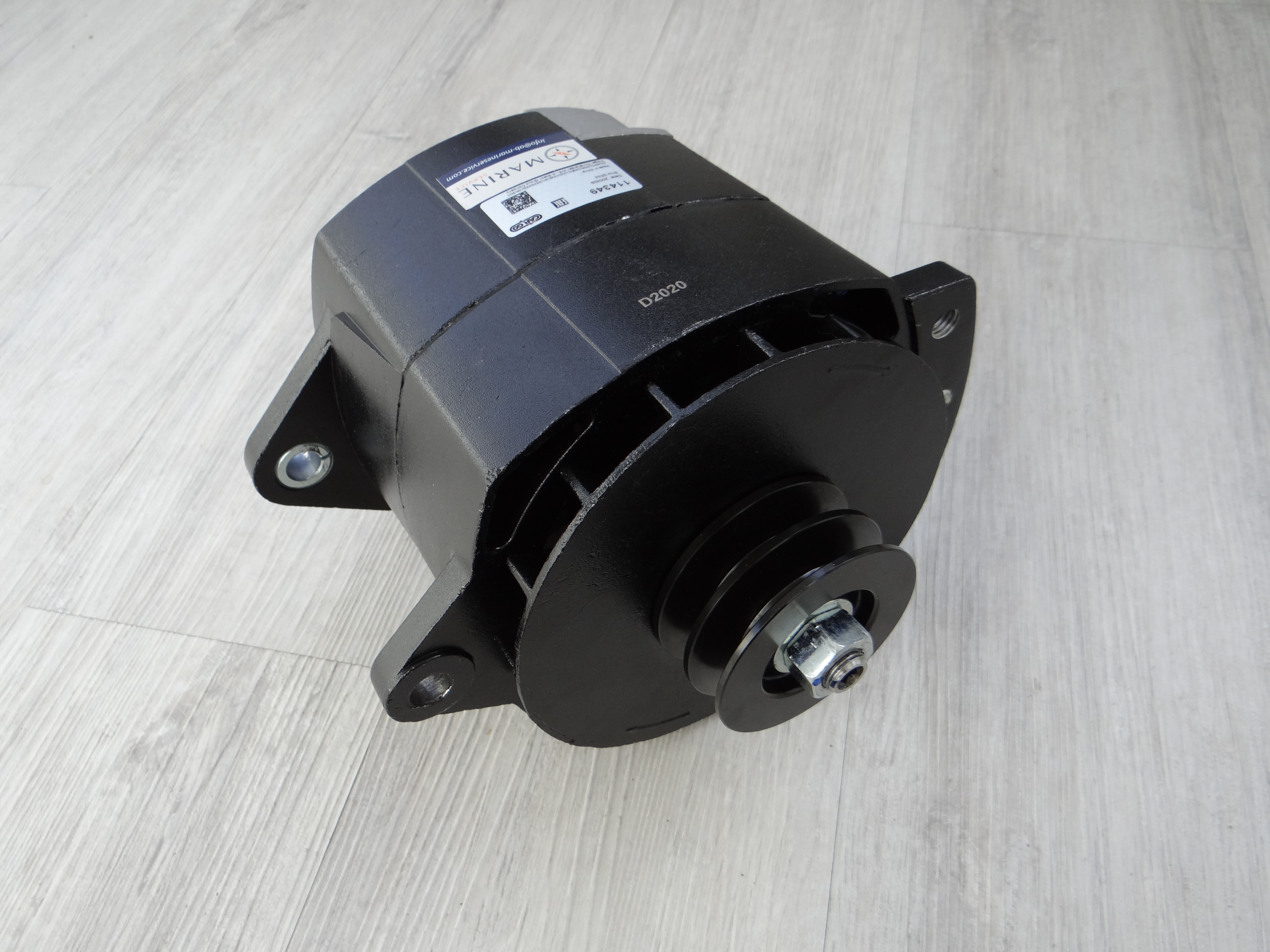 Ten derde moet je het aantal toeren van de dynamo af zetten tegen het toerental van de motor. Hoe doe je dat? Je meet de omtrek van de krukaspoelie (omtrek = 3.14 x diameter) en die van de poelie van de dynamo. In ons geval 3.14 x 221 mm versus 3.14 x 93 mm, een verhouding dus van 1 : 2.3. Dit betekent dat als de motor met 1000 toeren draait, de dynamo met 2300 toeren draait. Terugrekenend met een motor die normaliter rond de 1400 toeren draait op kruissnelheid en een dynamo die zijn 150 A levert vanaf ca. 4200 toeren, moet de poelieverhouding 1: 3 zijn. De diameter van de poelie voor de dynamo moet dus 221 : 3 zijn, dit is een diameter van 73 mm. Deze was niet leverbaar, maar met een nieuwe poelie van 78 mm, zit ik op 2.8, dat is dicht genoeg in de buurt van 1 : 3.