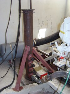 Na het aanbrengen van de Coppercoat op het onderwaterschip vorige week, moest ook aan de binnenkant van de standpijpen, waarop alle aan- en afvoerleidingen van het water worden aangesloten, Coppercoat worden gesmeerd. Op de foto’s zie je dat op de stuurboord standpijp (hoofdzakelijk voor aanvoer) de slang voor het koelwater van de motor al is aangesloten. Genoeg aansluitingen voor nog meer water naar bijvoorbeeld een generator of voor een watermaker (beiden toekomst muziek). Op de bakboord standpijp wordt straks diverse afvoeren (zwart watertank, grijs water) aangesloten. Op deze foto zie je links 2 slangen uit het blok komen. Via de ene verdwijnt ongeveer de helft van het koelwater in de uitlaat om deze te koelen en het geluid te dempen. De andere slang leidt naar de oliekoeler van de keerkoppeling om die nog extra te koelen en daarna is op advies van de leverancier Vink diesel de slang aangesloten op de schroefas waar het koelwater dient ter smering van de schroefas en op die manier naar buiten wordt geperst. Een bijzonder constructie.