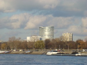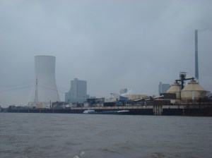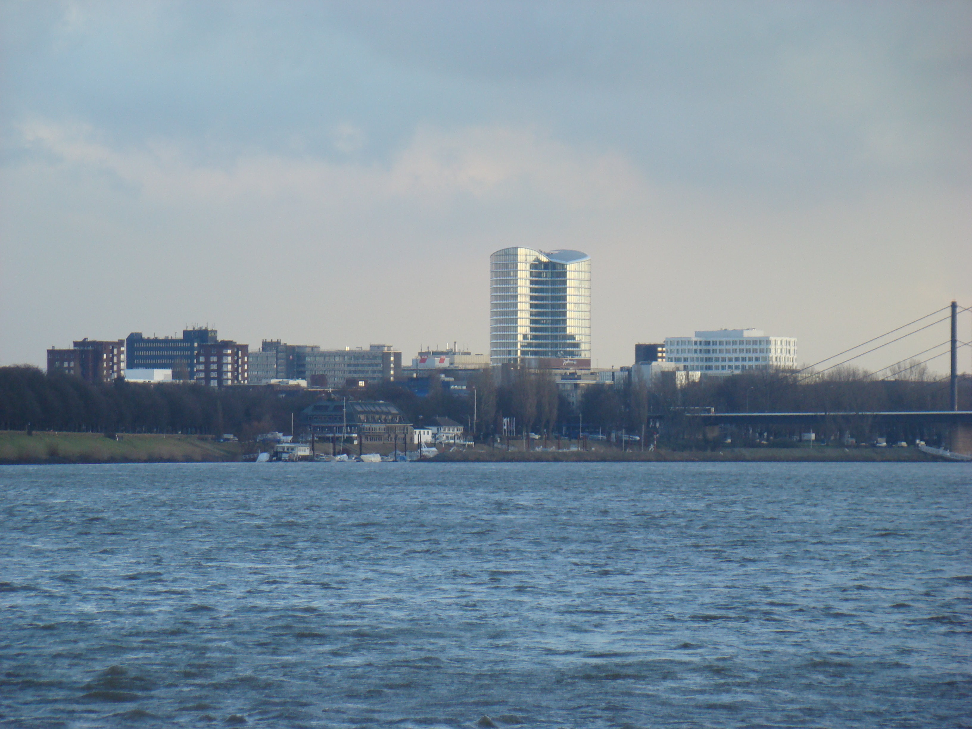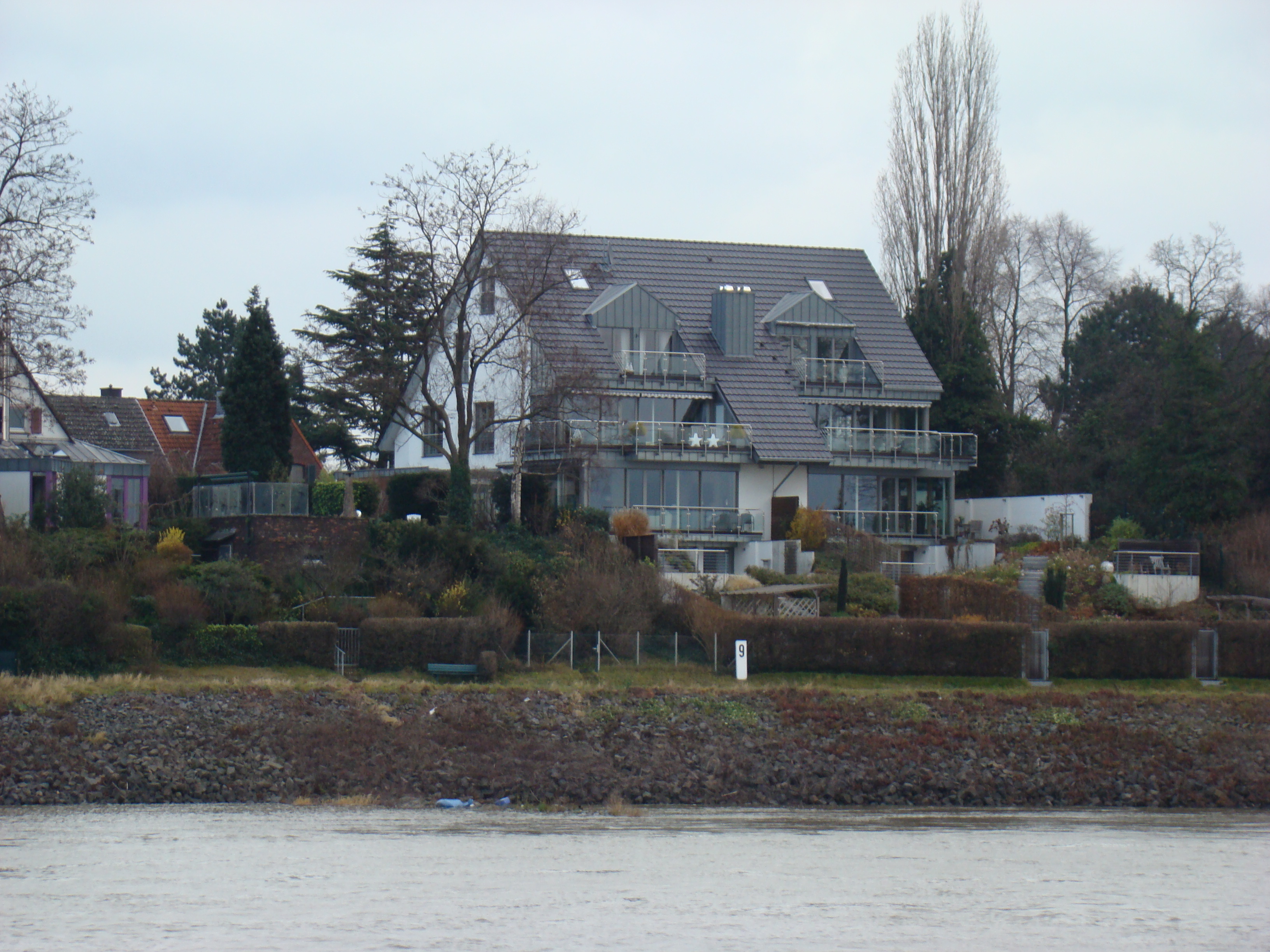 We krijgen de smaak te pakken, ’s avonds in het donker nog wat doorvaren en ook ’s ochtends in het donker beginnen. Zo ook de derde dag met het doel om zover mogelijk voorbij Düsseldorf te komen, zodat we op de vierde dag bij daglicht in Oberwinter kunnen aankomen. Totaal 110 km van Wesel naar Hitdorf was de bedoeling, met 6 km stroom tegen konden we dan een snelheid halen van ongeveer 10 km per uur, dus totale reis 11 uur. Dat was het plan. Iets na zevenen was het vertrek weer en in de loop van de dag passeerden we diverse imposante industriele complexen langs de Rijn, grote kolencentrales, overslagplaatsen, Bayer en andere vage fabrieken. Op de ‘goudkust’van Düsseldorf staan fraaie villa’s vlak langs het water.
